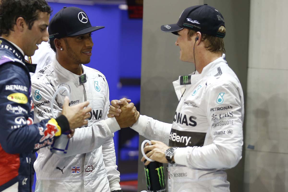 | 季中幾乎翻臉,到了接近季末,Hamilton和Rosberg突然又會握手了!這當然是旁邊Ricciardo所不樂見的。 |