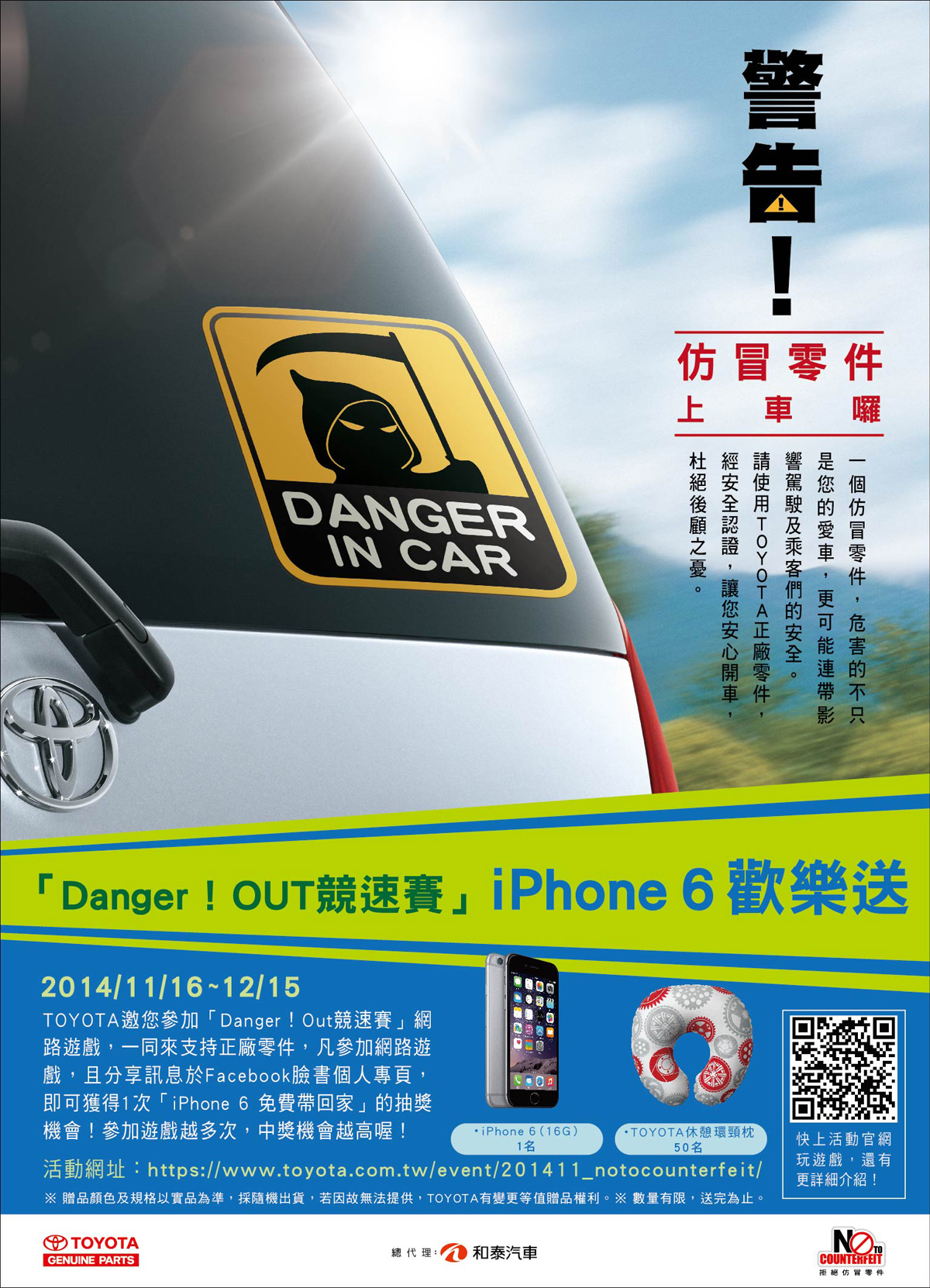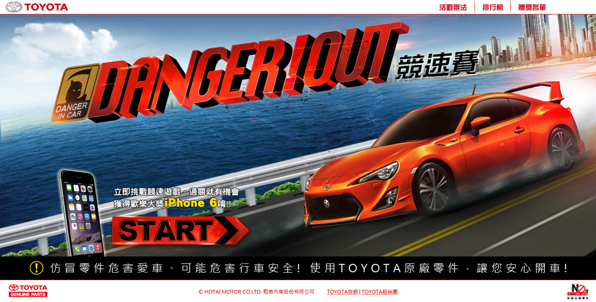 今年和泰汽車特別規劃「Danger!Out競速賽」網路遊戲,讓車主能透過活動的參與,了解正廠零件與仿冒零件的不同。自2014年11月16日至12月15日止,凡參加「Danger!Out競速賽」網路遊戲,且分享訊息於Facebook臉書個人專頁,即可獲得1次「iPhone 6 免費帶回家」的抽獎機會!參加遊戲越多次,中獎機會越高喔!詳細內容請參閱2014年反仿冒零件活動網頁( https://www.toyota.com.tw/event/201411_notocounterfeit/ )、TOYOTA官方網站、TOYOTA Taiwan FB網頁。