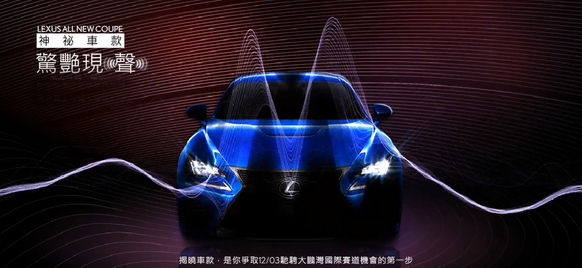 現在就前往LEXUS驚豔現聲網站: http://www.lexus.com.tw/event/rc/ 揭曉即將上市的神秘車款,就有機會獲得一生一次的無價賽道體驗。機會稍縱即逝,行動要快。