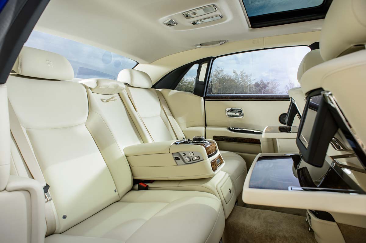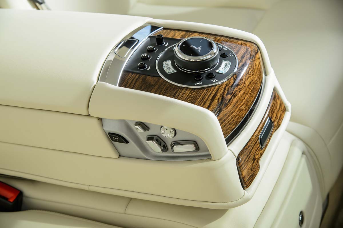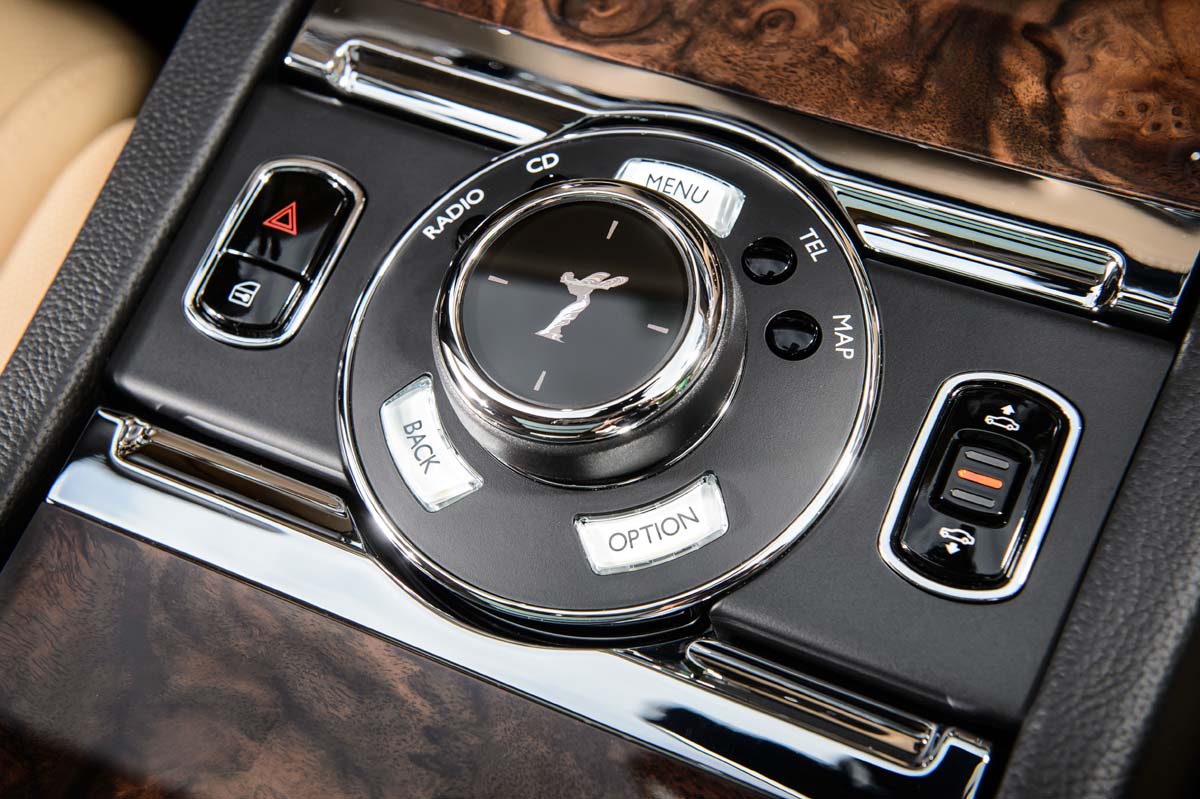 打開車門,Ghost Series II的內裝架構與風格仍延續該品牌一百多年來的一貫傳統,許多開關、控制鈕均採用鍍鉻製品,再結合木紋內飾板與古典風味十足的指針式儀錶,一些開關如恆溫空調的控制也都取材自過去的典型架構,讓人感覺她似乎仍停留在上一個十年,而非現今到處瀰漫的電子風潮,但實際上只要按下一個開關,會發現目前所有最新的行車資訊、通訊及影音控制介面都沒有缺席,並透過單一的整合控制介面來操作。10.25吋液晶螢幕就躲在中控檯的活動面板底下,後座也同樣設置兩套可收折的活動螢幕,透過便利的主控旋鈕及環繞周圍的四個快捷功能選擇鍵,不管是前座駕駛或後座乘客皆能快速執行欲選擇的服務項目,且此次Ghost Series II採用的整合控制旋鈕又再次於不經意間流露出奢華意涵。新的整合控制旋鈕此次在表面特別加入水晶玻璃,上頭除了鑲有女神圖像還提供觸控功能,觸感細緻且使用的特殊水晶材質完全不會留下明顯指紋,甚至還能夠比照智慧型手機的操作方式進行手寫輸入或以手指拉伸縮放螢幕上的圖像大小及畫面移動,這也點出一個重點,傳統還是可以跟科技並存。