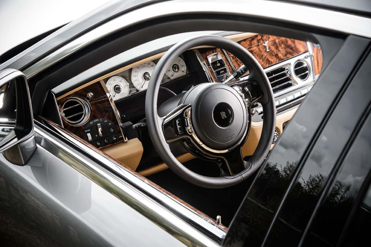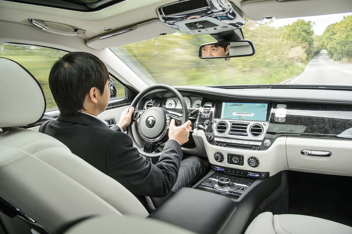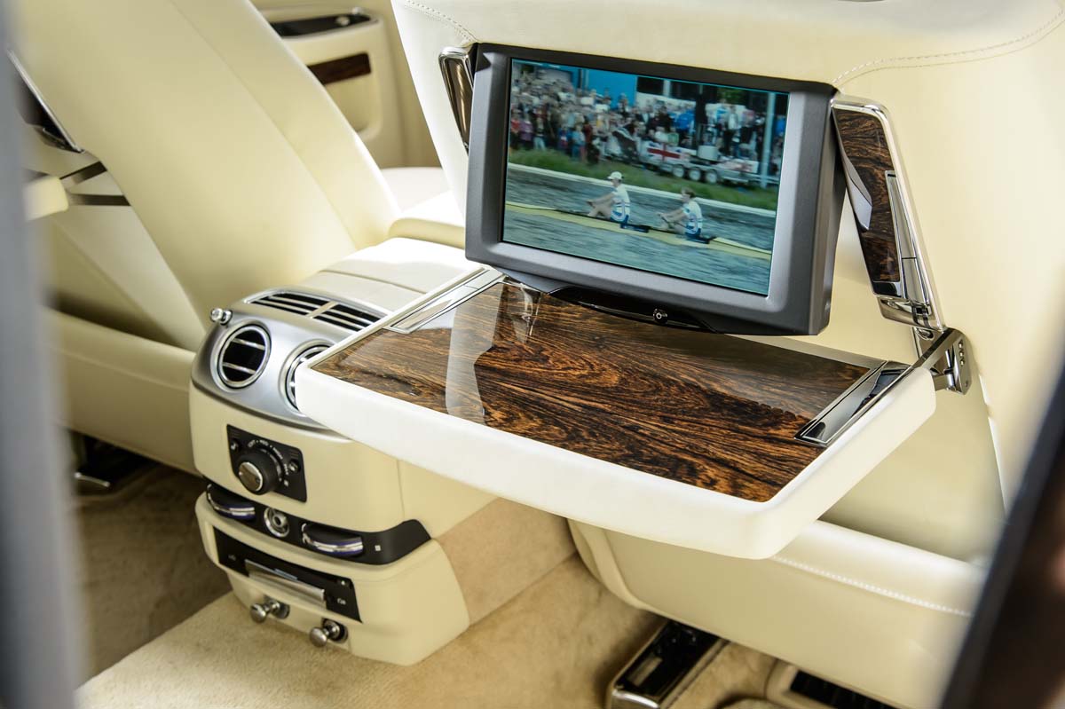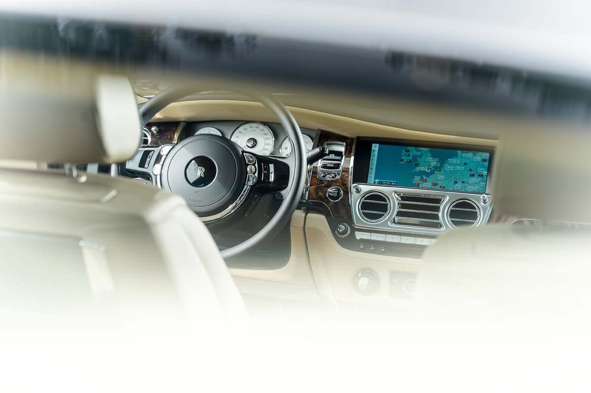 打開車門,Ghost Series II的內裝架構與風格仍延續該品牌一百多年來的一貫傳統,許多開關、控制鈕均採用鍍鉻製品,再結合木紋內飾板與古典風味十足的指針式儀錶,一些開關如恆溫空調的控制也都取材自過去的典型架構,讓人感覺她似乎仍停留在上一個十年,而非現今到處瀰漫的電子風潮,但實際上只要按下一個開關,會發現目前所有最新的行車資訊、通訊及影音控制介面都沒有缺席,並透過單一的整合控制介面來操作。10.25吋液晶螢幕就躲在中控檯的活動面板底下,後座也同樣設置兩套可收折的活動螢幕,透過便利的主控旋鈕及環繞周圍的四個快捷功能選擇鍵,不管是前座駕駛或後座乘客皆能快速執行欲選擇的服務項目,且此次Ghost Series II採用的整合控制旋鈕又再次於不經意間流露出奢華意涵。新的整合控制旋鈕此次在表面特別加入水晶玻璃,上頭除了鑲有女神圖像還提供觸控功能,觸感細緻且使用的特殊水晶材質完全不會留下明顯指紋,甚至還能夠比照智慧型手機的操作方式進行手寫輸入或以手指拉伸縮放螢幕上的圖像大小及畫面移動,這也點出一個重點,傳統還是可以跟科技並存。