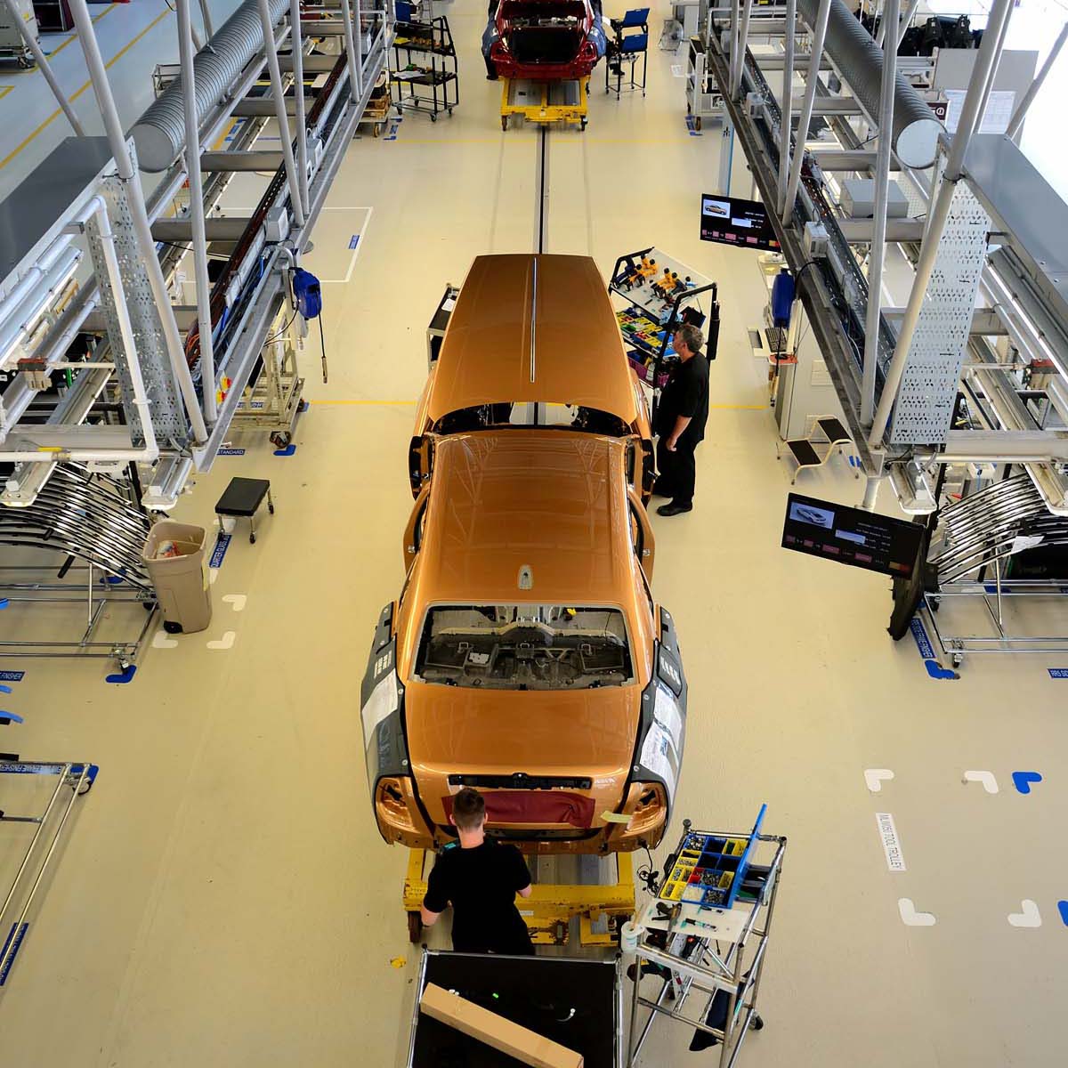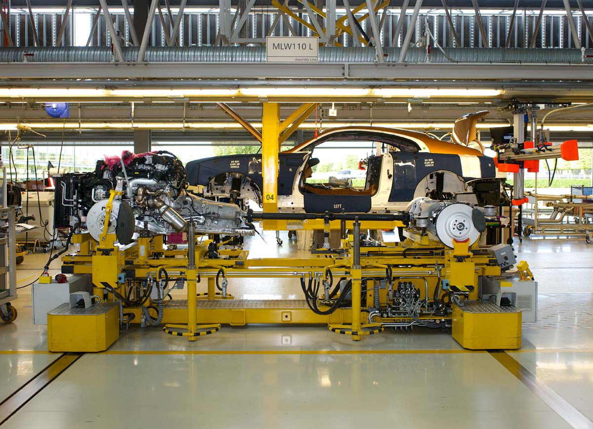 | V12引擎、變速系統與懸吊等周邊系統會先固定在一平台上,然後將車身降下並透過16顆專用螺絲讓兩者接合。 |