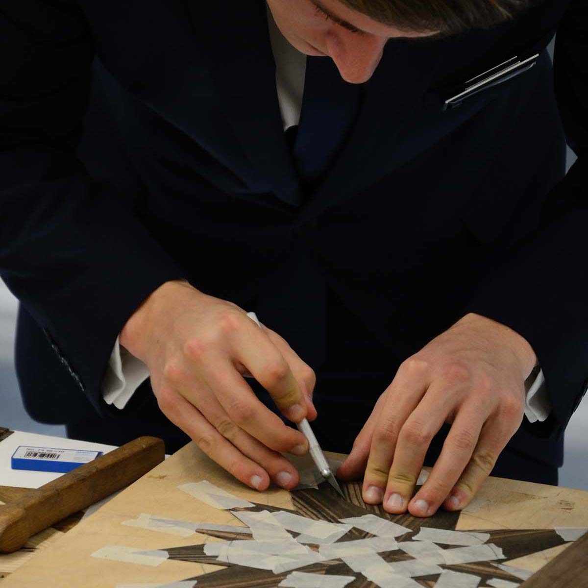 | 如果需要特殊的Bespoke客製服務,資深工匠能夠依客戶所指定的圖騰以不同紋路的木片拼出圖形,某些個案甚至需要三個月的工作天來製作。 |