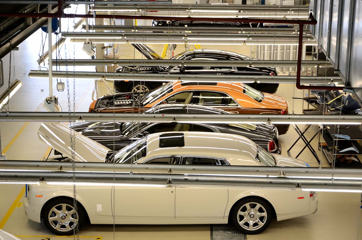 於2003年1月1日開始正式運作的Goodwood生產線,一開始只生產Phantom,隨後於2010年加入Ghost車系。目前Phantom與Ghost的V12引擎均由位於德國Dingolfon的引擎製造廠所供應,車體沖壓與組裝成型則來自慕尼黑的工廠,後者運到Goodwood之後會先經過品管確認才進行塗裝與烤漆程序,且每部車都需經過一星期的工作時數及七道塗裝後才會送至生產線。而組裝過程依車種不同的差異,每部車需經過15~16個工作站才完成所有組裝程序,且每一個工作站都提供充裕時間讓技師以純手工組裝並進行重複確認,藉此維持最高品質,因此產量至今每天最多只會打造出約15部車的Rolls-Royce。