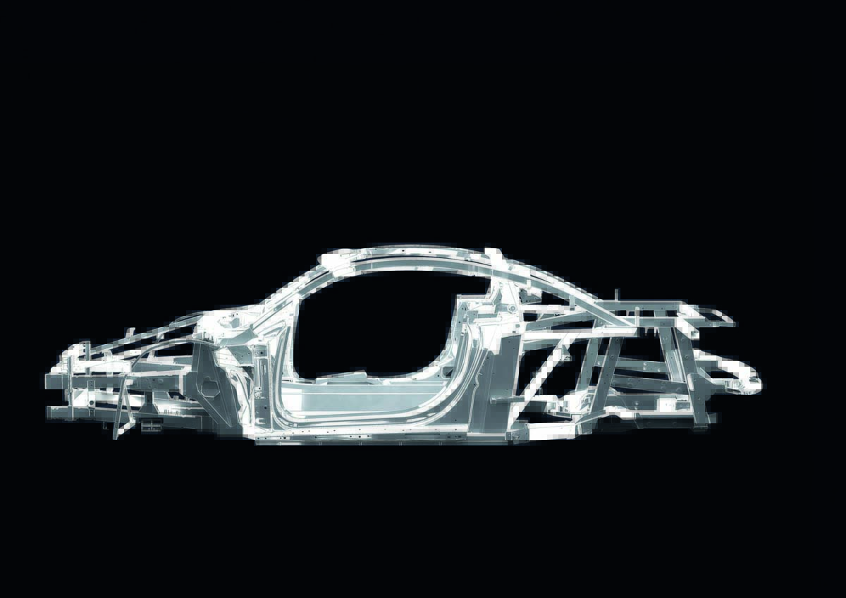 | 對於車身剛性的說明,原廠多半是透過圖中的車體結構圖來說明,但依然很少能給準確的數據,此圖為Audi R8的設計圖,可以看出駕駛艙為籠型車體結構,車頭前後則以骨架建置,是兼顧車重與剛性的好方法。 |