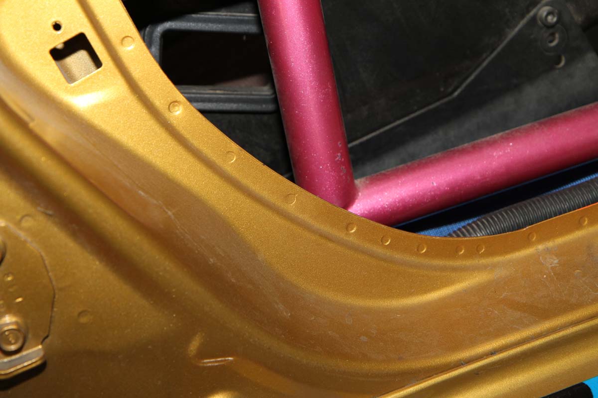 最後,全車點焊最好事先就把車輛架放在手術檯上,或專用治具上,把身體主結構焊好之後再來實施翻轉的細部焊接。以上所述這點是非常重要的,因為在一個不良的支撐環境下,受力的空車體是可能變型的,加上焊接時的伸縮、及應力的改變,如果車體並非固定在良好的治具下,例如車體呈現些微扭曲的不正常情況,此時在點焊上去,扭曲的車台就此固定無法調整回來,在車體基礎結構與幾何角度不正確的情況下,對於往後配重的調整、底盤的設定,都會有決定性的傷害,不可不慎。至於所有車體剛性補強作為中,效果最好的莫過於防滾籠的加裝,一套依據車種作過精密計算來設計的防滾籠,是有可能提升車體原結構強度數倍之多,這類型的防滾架,就會如同我們常在書上看見那些工廠賽車一般,採取全銲式,橫七八豎、好幾十點的防滾籠。關於防滾籠的介紹,筆者在第二部分將會有完整的介紹,在此先賣個關子。