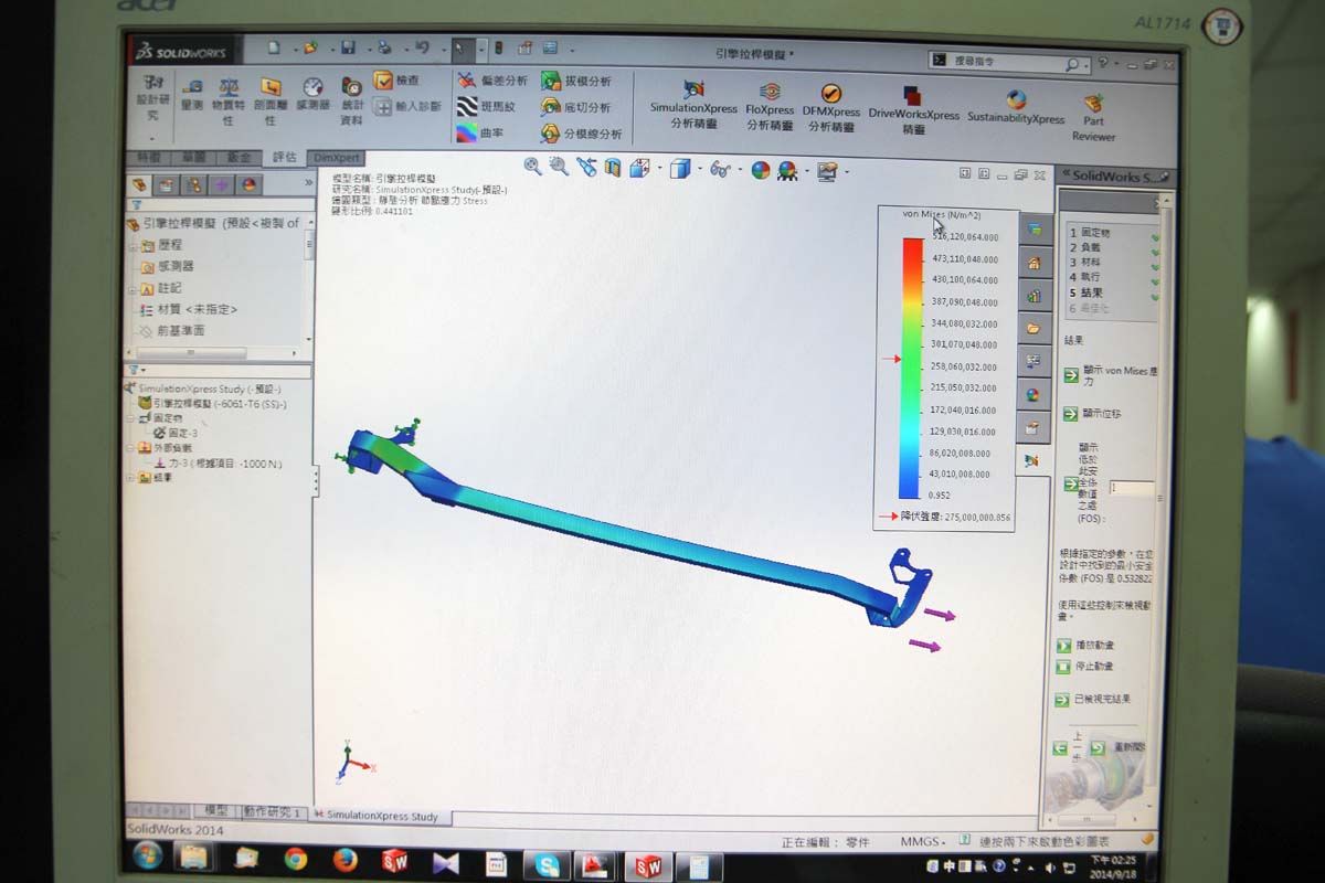 至於每組新車款的拉桿開發與製造流程,SPR都是先以實車進行拉桿角度的丈量與紀錄,之後憑藉著過去開發經驗與電腦繪圖,將新拉桿的雛形樣貌描繪出來,確定安裝孔位與橫桿高度/角度等,不會干涉到車輛結構後,就會進入Solid Work軟體的應力測試,該軟體可模擬各種方向的應力大小,藉此找出拉桿強度較弱的地方,針對此處進行結構補強後,就可開始進入CNC程式的撰寫與實際上線生產的步驟,此時生產出來的產品還處於測試樣品階段,試裝於車輛上沒有問題後,才會開始大量生產,如果有問題需求修改的話,針對需修改的項目進行調整後,還會重新回到開發階段,再進行一次所有軟體與實際測試,通過所有項目後才會進入量產階段,這些步驟都是為了讓SPR生產出來的產品,擁有極高的品質與精度。