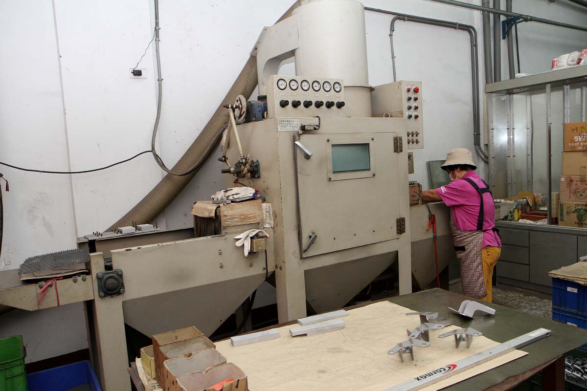 | 這部機器為表面噴砂機,可在金屬素材上噴上一層金屬細砂,提高產品美觀性,並減少表面氧化的情況。 |
