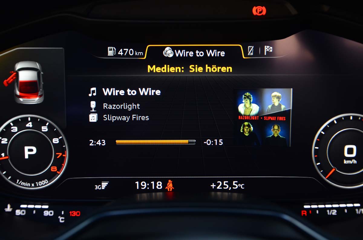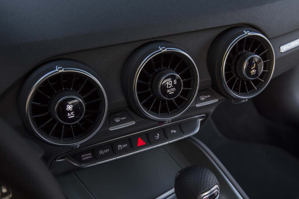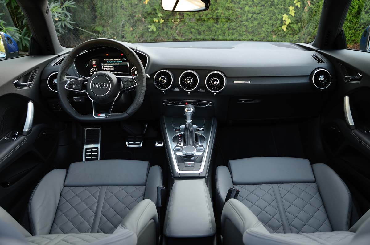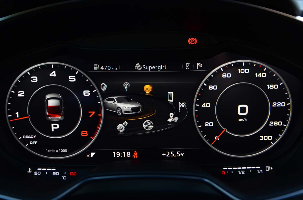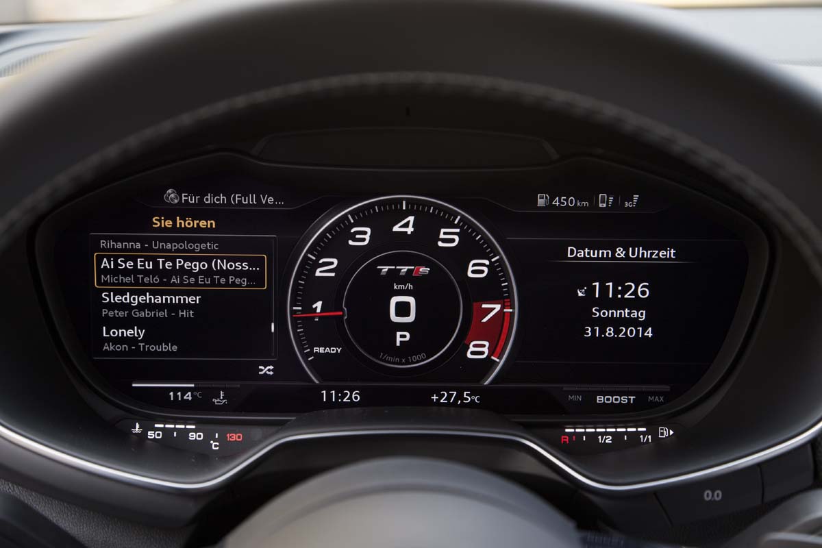 初代TT的車艙設計曾一度引領市場潮流,而此次的New TT讓人感覺過去的原創精神又回來了,坐進駕駛艙,由鋁合金材質製作的車門把手、排檔頭與大量的內飾板與黑色內裝形成強烈對比,且將空調控制面板拆解而融入三個鋁合金出風口之中的概念更是讓人激賞,裡頭的氣流導片形狀甚至還取材自噴射引擎的渦輪扇葉,確實相當迷人,不過最能傳達出新世代跑車革命性突破的技術還是讓人目不轉睛的多功顯示儀錶板,12.3吋的大型液晶螢幕具備1400×540 Pixels的畫素,並將行車資訊、視聽娛樂、導航及通訊功能整合為一,對駕駛者來說是很酷的新奇體驗,且評價相當高的Bang & Olufsen音響此次也列為選配項目。
