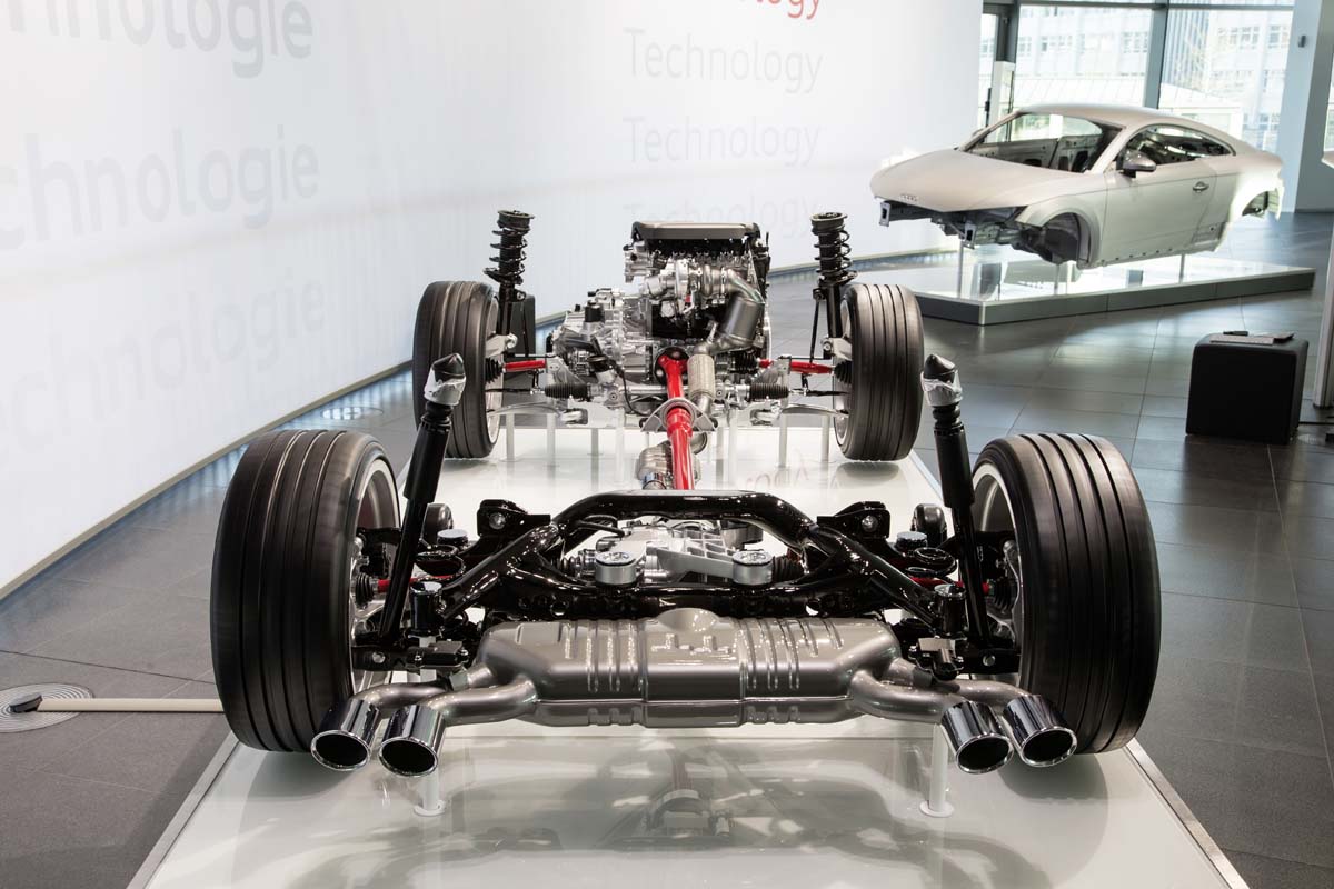此次原廠除了安排賽道試駕,現場也擺放了引擎、傳動系統與鋁合金車身的展示品,讓我們可以對New TT使用的科技有更進一層認識,不過原廠專家在介紹時的重點並沒有放在引擎或車身,而是Quattro全時四驅,這次New TT Quattro及TTS搭載的是針對MQB橫置引擎平台所開發的最新版Quattro,透過專屬電腦控制的中差,可隨時因應循跡性與抓地力的需求而改變前後輪的動力分配,除了一般行車與正常起步時下會用到前100:後0的比例之外,其他所有狀態都完全由電腦依實際狀況決定前後比例,而這樣的特性當然也已經在Ascari賽道的試駕過程中有了深刻體驗。