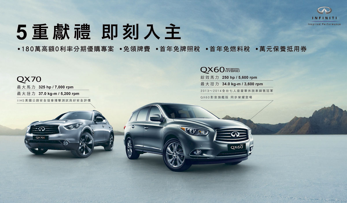 為慶祝 INFINITI QX70S 黑曜戰神首批配額已全數被搶訂一空及QX60自2013年以來持續佔據豪華品牌7人座休旅車銷售冠軍,INFINITI特別提供最尊榮的禮遇回饋消費者,12月起針對旗下各車款(註1)推出「5重好禮,即刻入主」限時優惠方案(註2),即日起至2015年2月17日止完成交車、掛牌之客戶,除享有新台幣180萬元高額零利率分期專案、首年免牌照稅及免燃料稅、免領牌費,更有萬元保養抵用券優惠。此外,INFINITI QX60 HYBRID更推出限量40台免費升級豪華娛樂影音系統(註3),讓您輕鬆入主風格菁英最愛的魅力車款,體驗INFINITI的無限魅力。