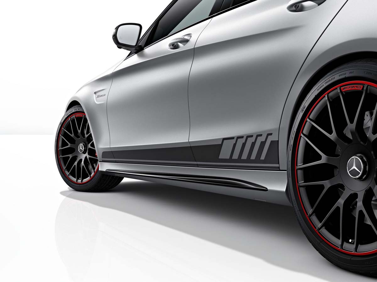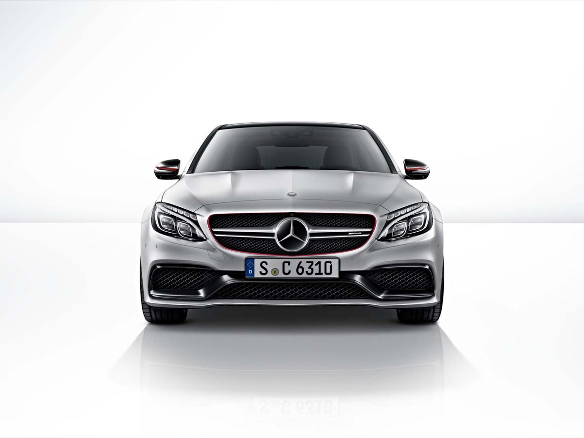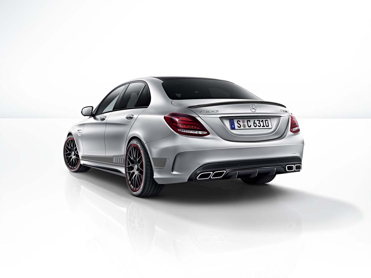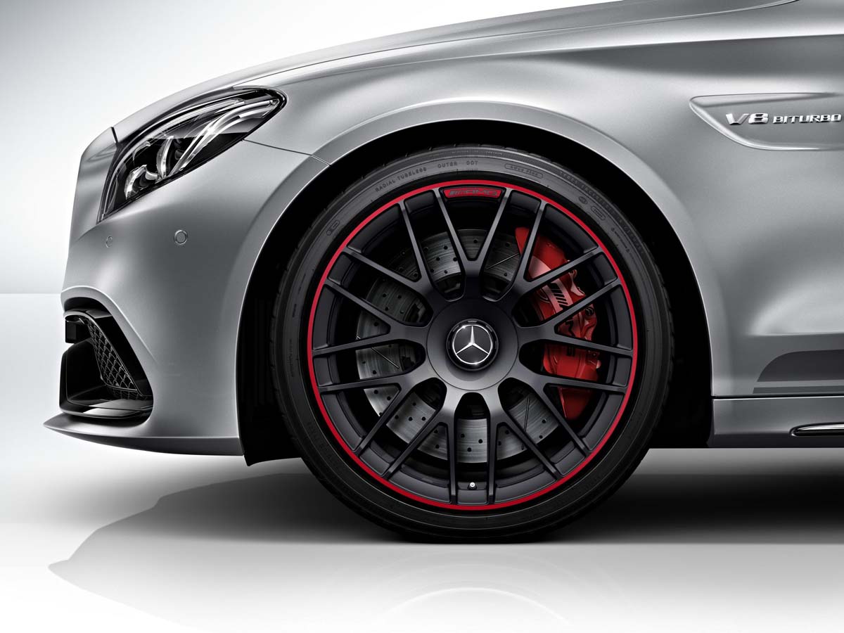 首先外型保持相當流線動感,造型的變化包括在前保桿部分換上更霸氣、低伸的款式及側裙,後方與保桿造型整合的方形雙側四出尾管清楚標明了C63 AMG的身分象徵,而車側一如往常植入了新一代性能車款的象徵V8 Biturbo標誌,最後穿上啞光黑與紅色塗裝的鍛造輪圈245/35 R 19(前)和265/35 R 19(後),整體更趨近於賽道車款模樣。內裝部分採一貫熱血風格,運動型座椅搭配黑色Nappa真皮與菱形格花紋和紅色縫線對比、方向盤的12點鐘方向還設有紅色指示點,加上鑲著AMG字樣,兼具質感時尚還提醒著別忘了這是輛性能猛獸呢!