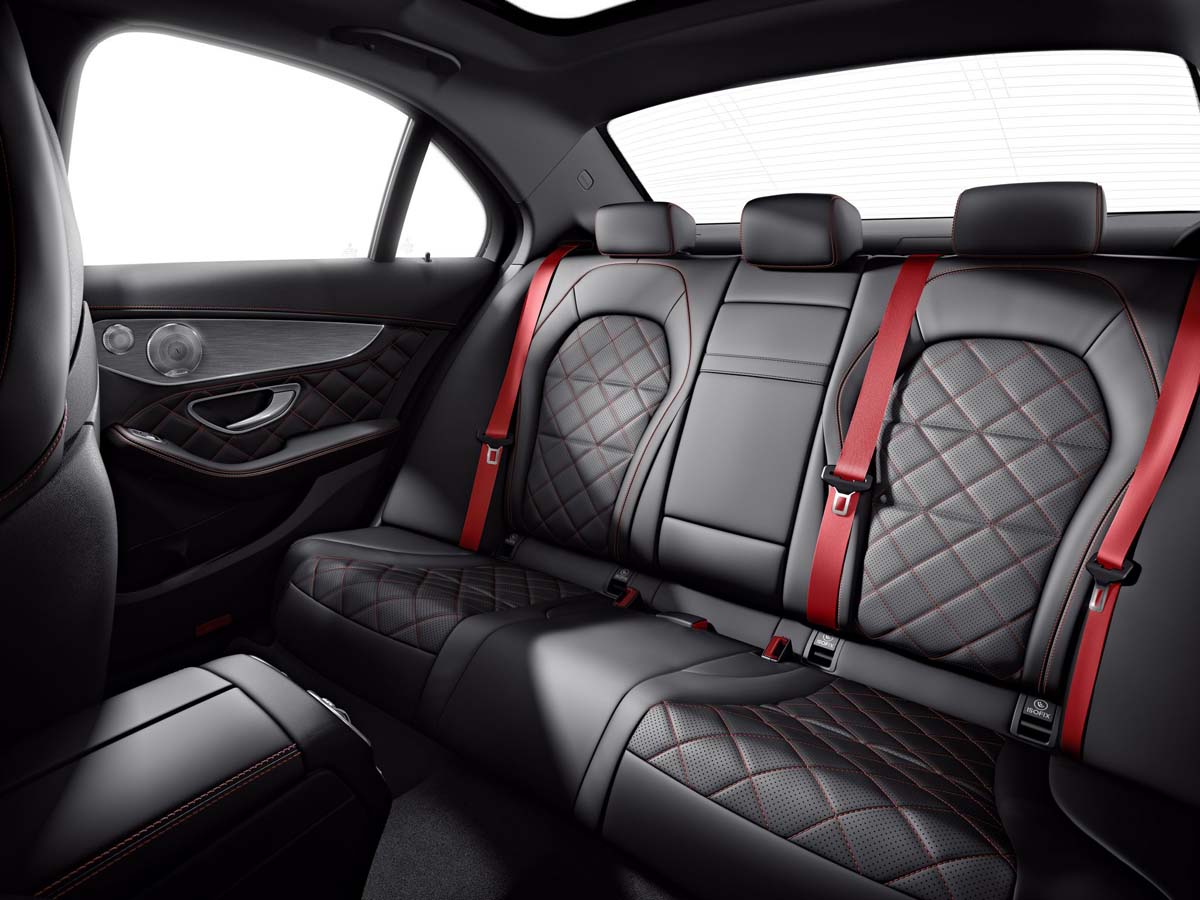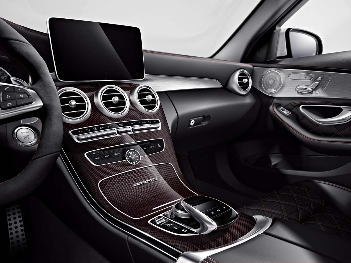 | 內裝的配置上理所當然將與現行W205車系共用相同基礎,三幅式方向盤在質感與握感表現均相當優異,只在細節上增添了性能元素,例如底部平齊的麂皮方向盤、貫穿整個中控台的線、碳纖紋路儀表及中控台、紅色designo座椅安全帶…等。 |