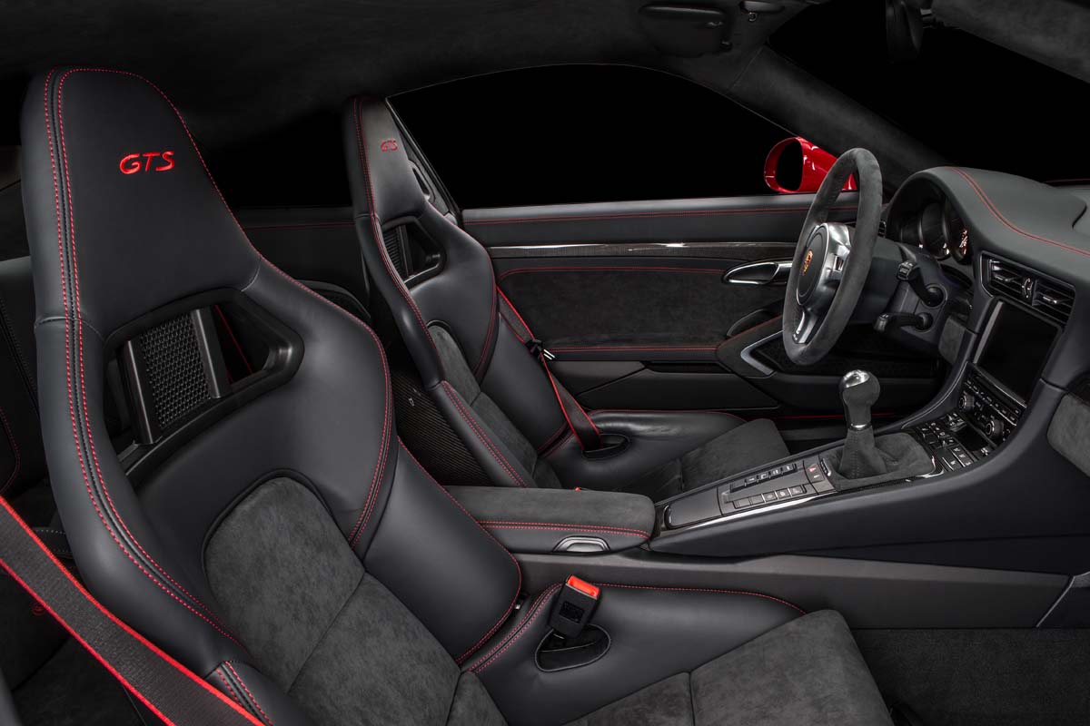 911 Carrera GTS擁有與四輪驅動車款相同的寬體車身,此一寬體設計也讓車輛的曲線變得更為明顯,除了寬體車身之外,車身裝飾細節大多數採用黑色處理,讓車輛造型看來更為精悍,部分的造型設計也進行了變更,除了追求視覺效果之外,全新設計的空氣力學組件也帶來了更好的散熱與空力表現。在內裝部分新車也採用了強調運動風格的設計,大量使用Alcantara麂皮縫製的內裝組件包括方向盤、排檔桿與座椅,車門上的置物空間外蓋也採用相同材料縫製,除了使用Alcantara麂皮之外,新車還加上了鋁合金以及碳纖維的裝飾;另外,特別值得一提的是雙門車型還可以選擇將後座移除,進一步降低車重。