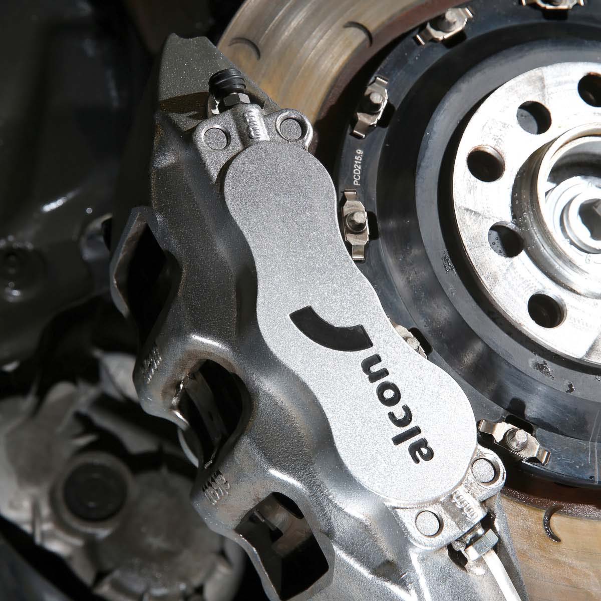 | 原廠的單向雙活塞卡鉗實在不夠美觀,Alcon前六後四卡鉗將鋁圈內塞滿才叫帥。 |
