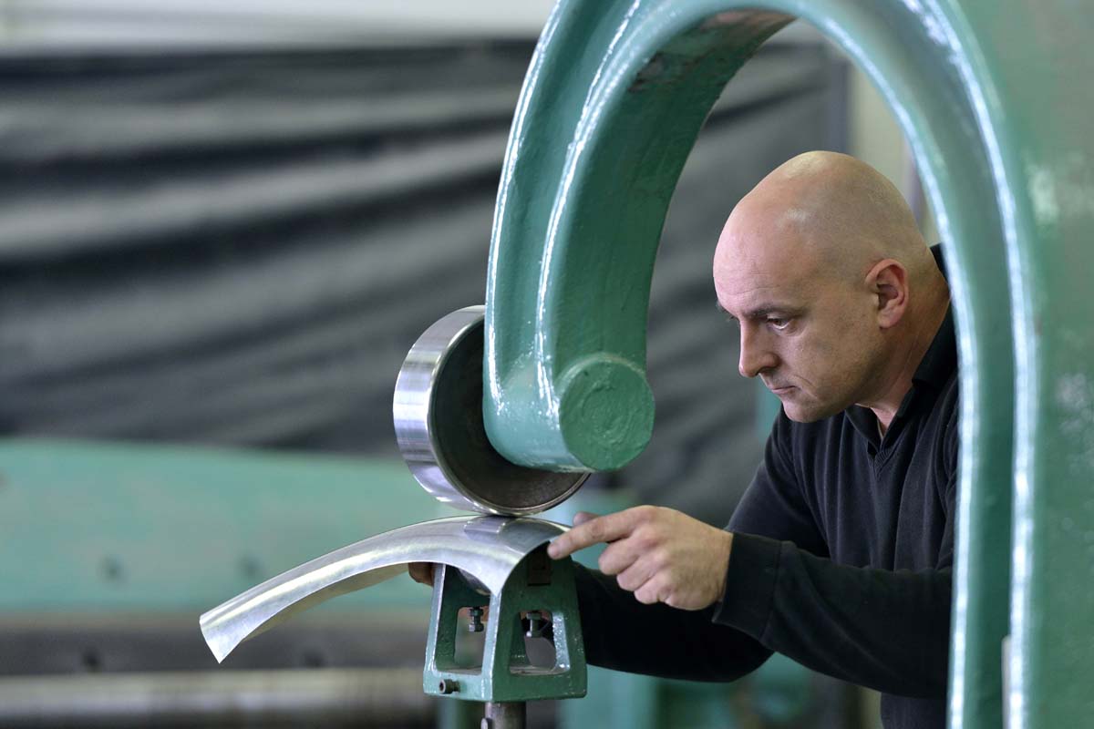 | 名為English Wheel的巨大折彎機是製造鈑件的重要道具。 |