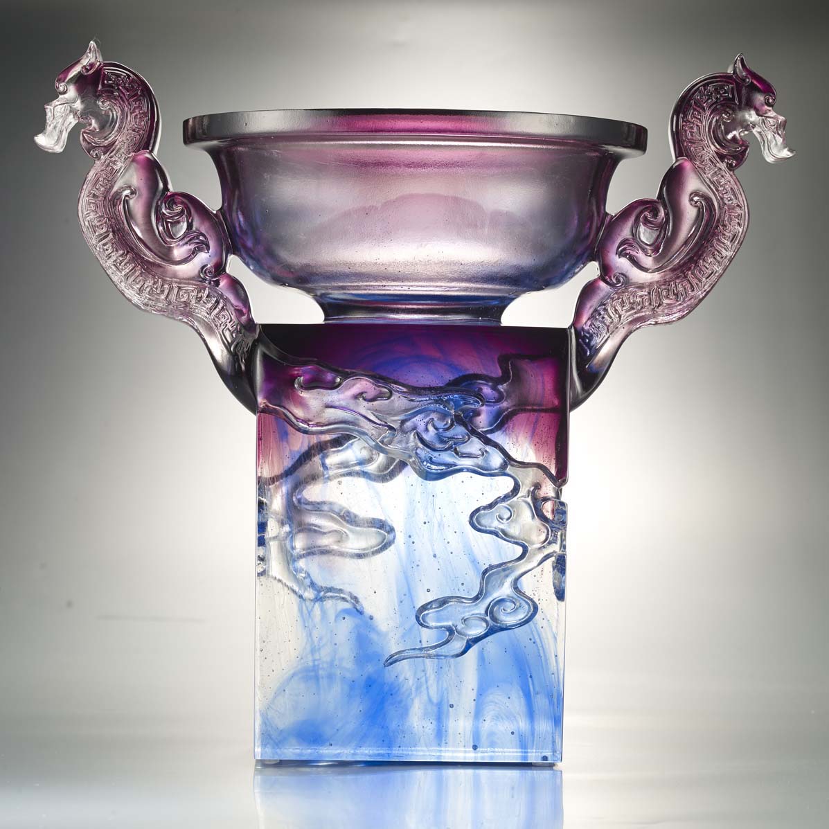 琉園一向擅長以通透的琉璃為文化述說載體,發現易經似乎納含所有華人文化中的哲理層面,故以《易經?乾卦》的卦辭「元亨利貞」為發想,將其概念與「中國鼎」作結合,創作出四件當代鼎器,巧妙說明「元亨利貞」所代表的「開創、通達、獲利、成就」四種樣態。本次?問鼎?系列,共有【開元】、【亨通四海】、【無往不利】、【貞觀】等四大件鼎器,不但寓意深遠,更有傳家之價值。