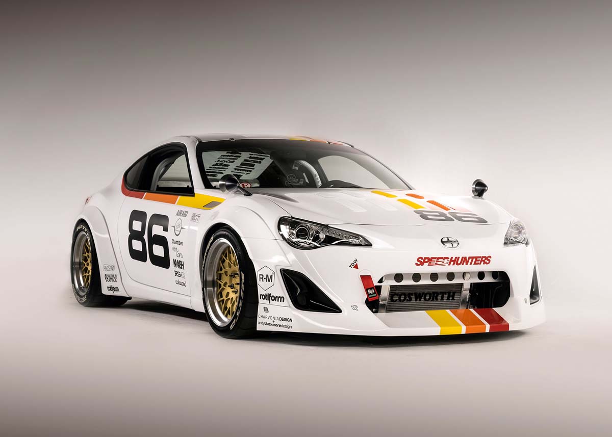 另一輛將後視鏡拉到車頭,有些復古味道的FR-S,是由SpeedHunters推出為了參加2014 Scion Tuner Challenger的改裝實車,全車幾乎是拆空進行廠車化設定,Cusco四點式防滾籠、Cobra RS桶型座椅、賽車方向盤等,外觀有著寬體車身、類似Nascar的尾翼、快速加油孔等,動力部分則是改裝Cosworth機械增壓套件。