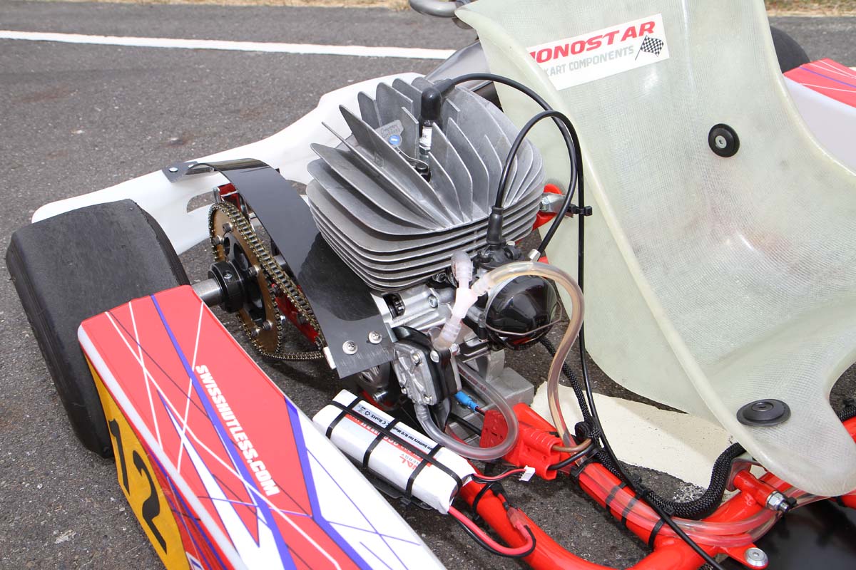 至於引擎則同樣採用Swiss Hutless所提供,型號為Rocky的50c.c.四行程引擎,該引擎最大馬力可提供約9匹的水準,以筆者當天在嘉義大林小型賽車場看小朋友開起來的感覺,提供給國小3年級以上的小朋友使用,只要熟悉車速與駕駛方式,操控起來還算簡單,且同時還能獲得不錯的訓練效果,如果換成馬力較不足的引擎來使用,高速感不足下無法有效訓練小朋友對加減速的控制能力,且軟弱的馬力對油門踏板的控制敏銳度也無法有效培養。