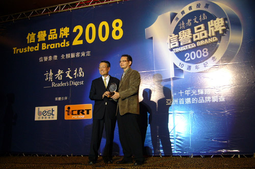 2008讀者文摘「信譽品牌」大調查,係由第三公信單位尼爾森公司執行,調查地區涵蓋台、港、中國大陸及菲、新、馬、泰、印度等八個地區,共寄發56萬份問卷,除問卷調查外,每個地區並同時以電話訪問方式取得有效樣本。