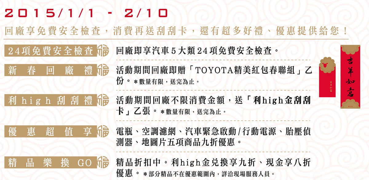 TOYOTA台灣總代理和泰汽車於2015年1月1日起至2月10日期間,舉辦「TOYOTA歲末健診– 羊羊喜氣GO好運」活動,活動期間回廠享24項免費安全檢查,還可獲得『新春回廠禮』,消費再獲『利high金刮刮卡』,通通有獎GO好運!