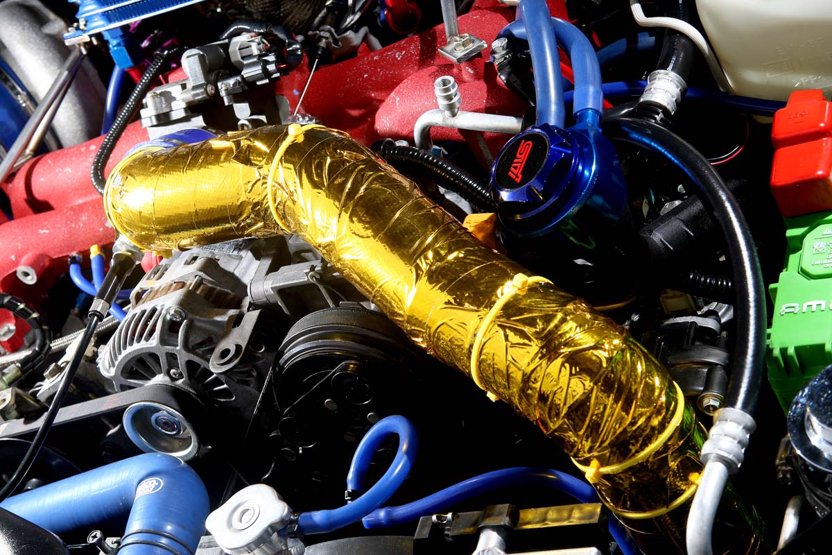 | 面對引擎大動力輸出效能,其所衍生的熱能問題,絕對不能忽視,在進氣管路上所包覆的類鉑金包覆皮層,據車主實際使用觀察,其降溫效果竟然有十度以上的溫差效益,這對於引擎進氣效率來說,影響可是相當大! |