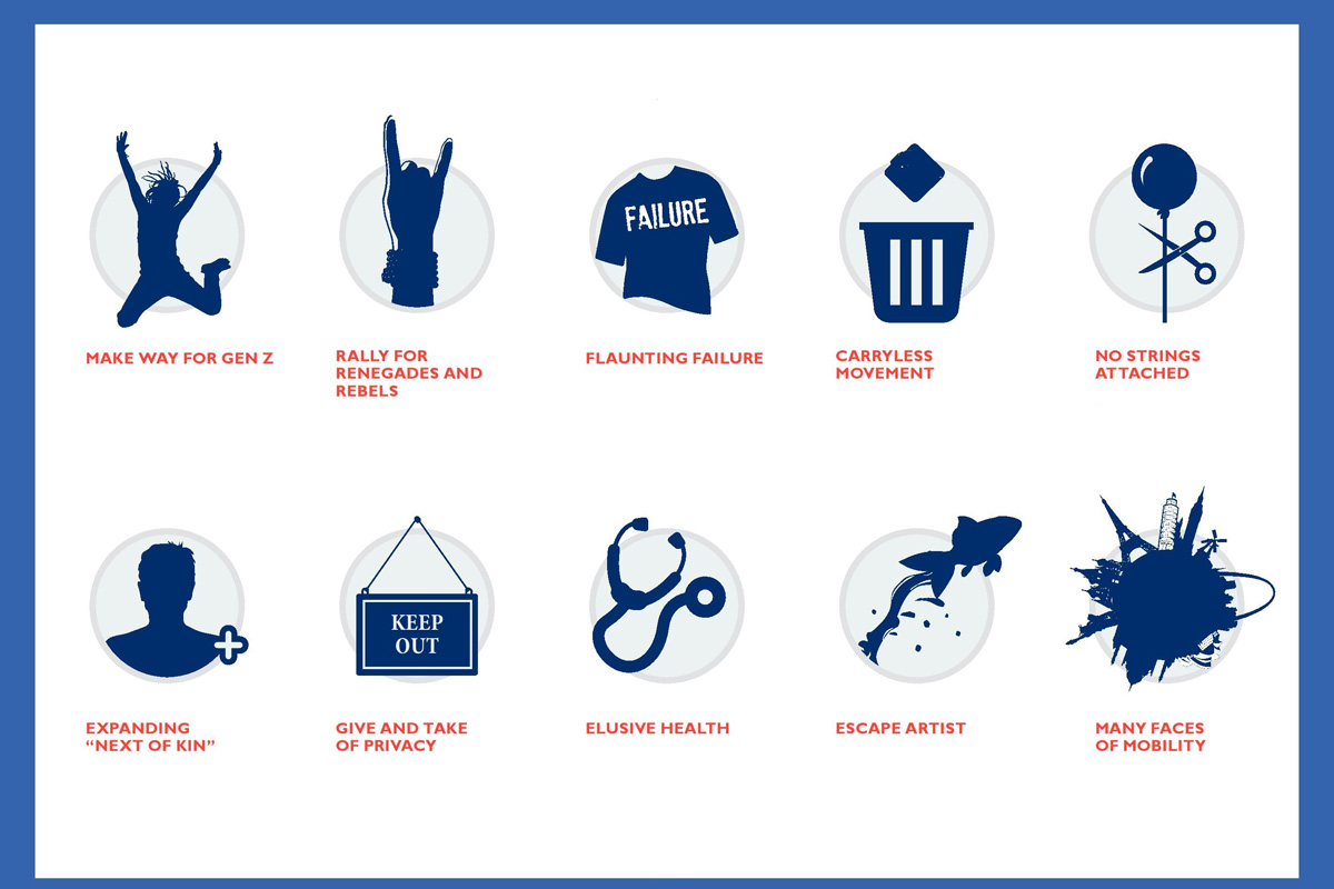 1.Z世代崛起(Make Way for Gen Z): 1993年後出生的Z世代自小即承受極高的壓力及目光,他們相信「好東西是給實際行動的人」。相信這群將近二十億的年輕人將對未來市場產生極大的影響力。