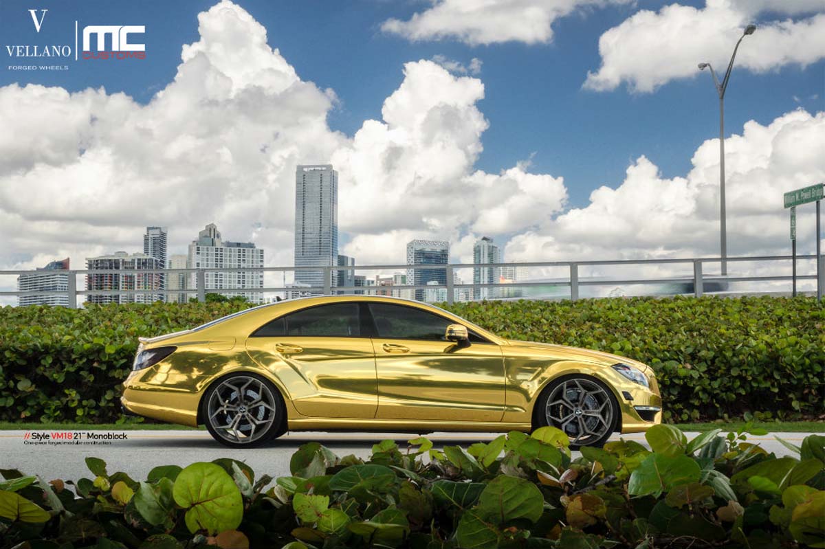 怎麼樣的車最吸睛?早些年開著超跑可以備受矚目,但現在,超跑多了、不稀奇了!因此現在把腦筋動到車身烤漆上。這一兩年流行一種所謂的「土豪金」車色,簡單來說就是電鍍金色塗裝,這種開到哪裡都能閃閃發光的車色,保證吸引眾人目光。來自邁阿密的MC Customs,可為客戶的愛車進行全車客製化服務,像是引擎調校、底盤升級等,當然也包含烤上絢麗的土豪金。MC Customs並沒有為這輛CLS 63 AMG進行任何動力升級,僅改裝一組21吋輕量化Vellano VM18鋁圈,並刻意使用古銅色塗裝,避免搶走電鍍金車色的風采。