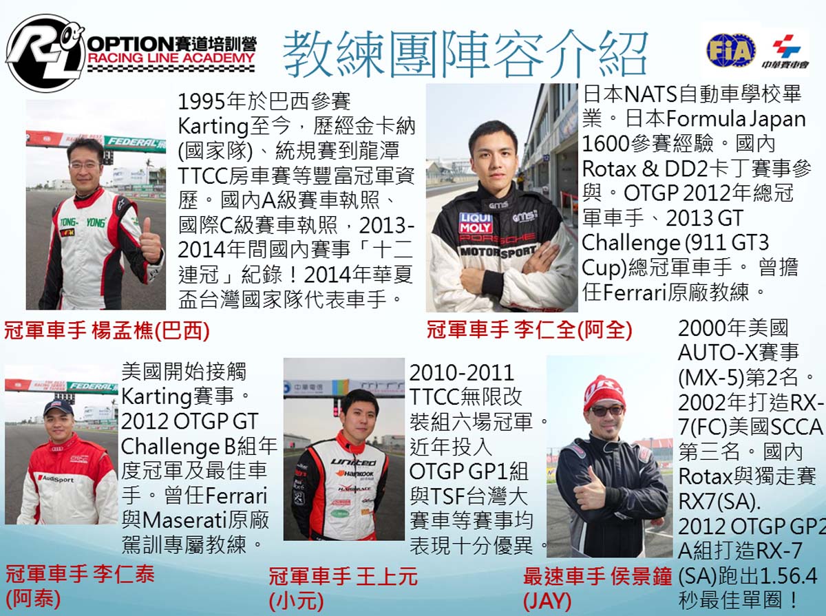 | 本課程將70位學員區分四大組來進行全天三個動態關卡的試駕體驗,OPTION R.L.A.共出動8位參賽、教學資歷可謂戰功彪炳的冠軍教練! |