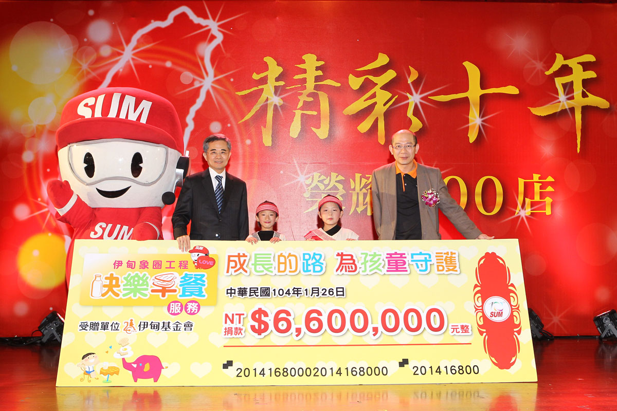 為了幫助台灣偏鄉學童能有充足營養的早餐可以吃,讓弱勢孩子也能快樂學習成長,SUM連續第三年與伊甸基金會合作舉辦「成長的路,為孩童守護」公益募款活動,在全省400家加盟車商攜手同心合作下,SUM江展魁總經理今天(1/26)在十週年慶活動中熱情揭曉2014年豐碩的公益成果,總計拼出660萬元捐款好成績,這些善款將全數捐贈給伊甸象圈工程計畫-《快樂早餐服務》,作為偏鄉孩童早餐經費之用!