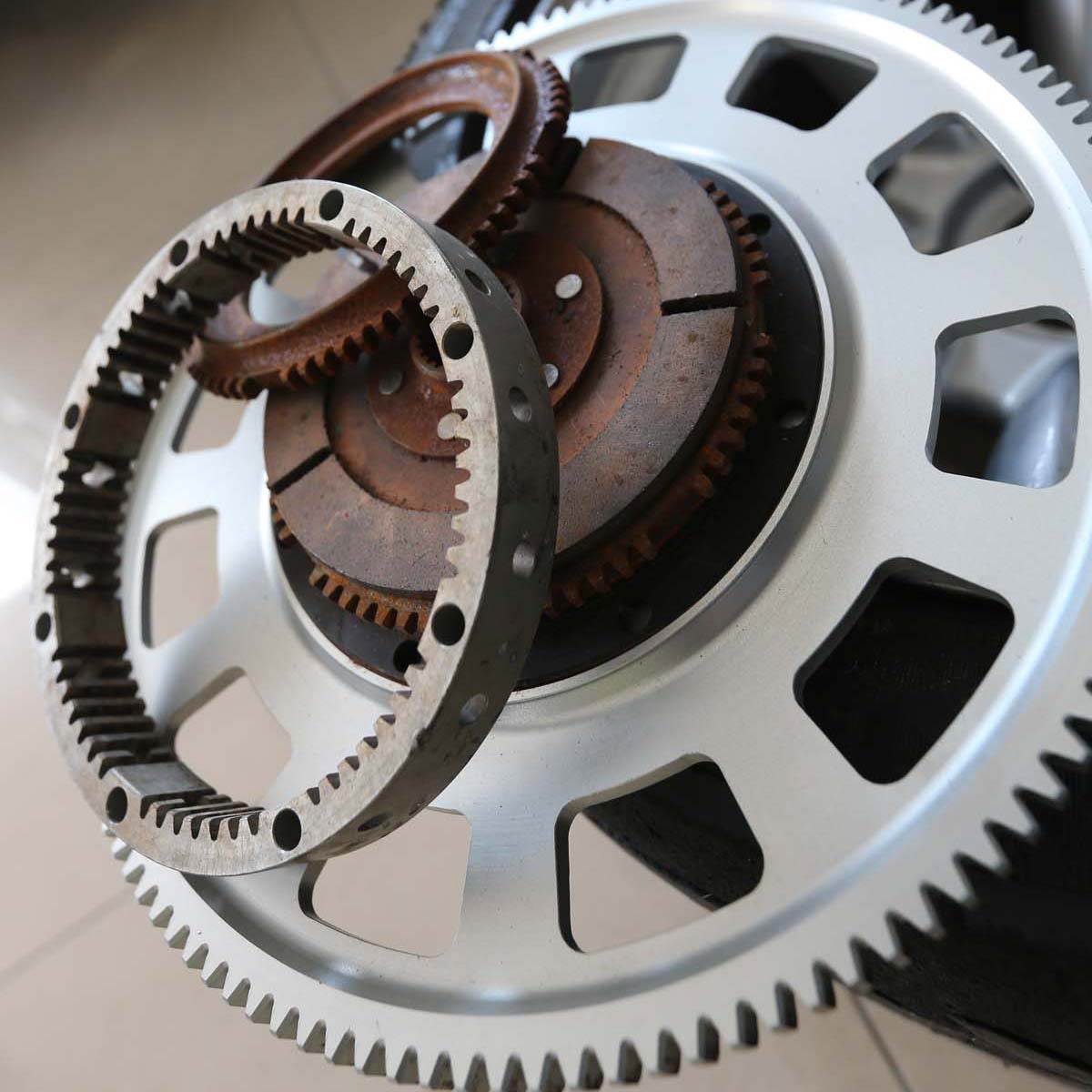 | 離合器的選擇為了降低慣性,離合器及飛輪採用上與F1相同技術的強化品,雙片式設計整體重量不到5kg,飛輪的重量更是用一根手指頭就能舉起。 |