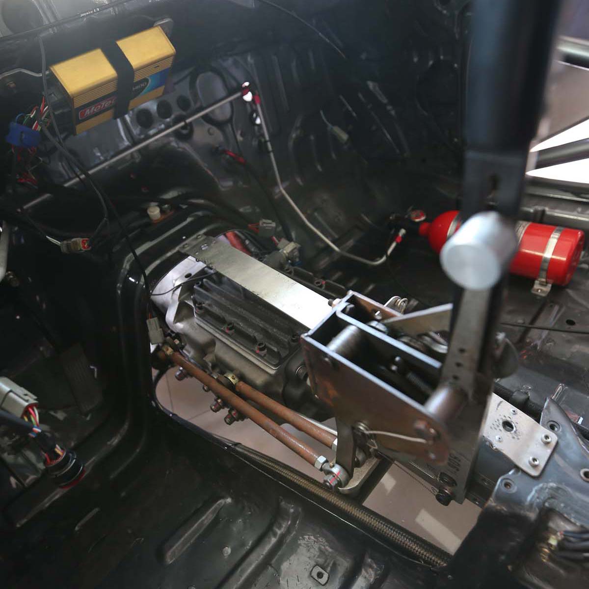 變速箱部分則是為了保持車身重量及高轉速引擎所需的延伸,Jay直接購入美國直線加速車最愛的JERICO四速序列式變速箱,JERICO變速箱相當的美式風格,能購入就只有變速箱本體,而這本體還不包含獅頭,因為他們覺得不知道會裝在什麼車上,或是車主有什麼樣的打檔習慣,習慣的排檔高低等,與日本包套的序列式變速箱販售模式完全不同,因此所有的排檔機構、連桿也都是由Team Orange由零開始反覆測試、打造。