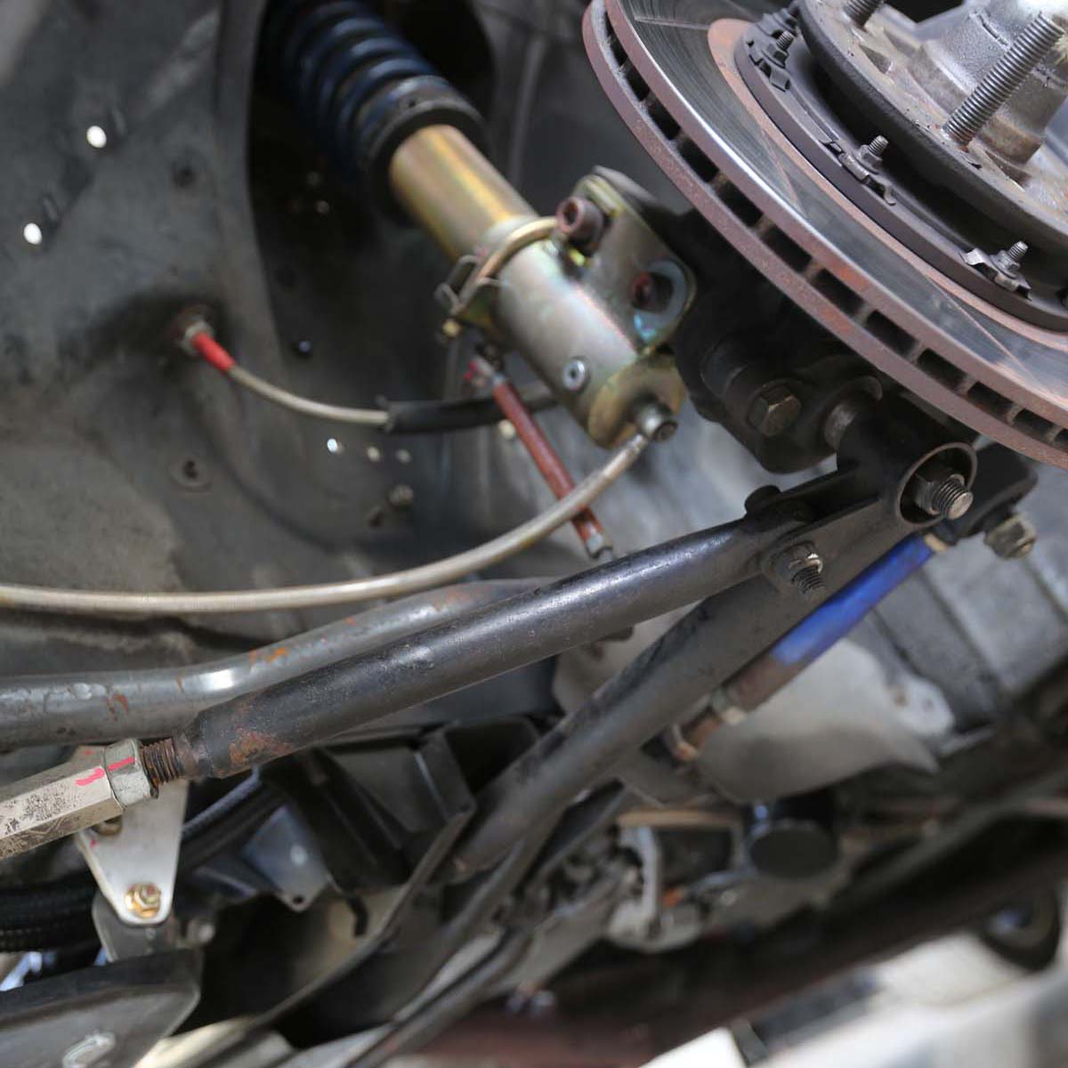 前軸的部分相當好處理,為了要延長左右軸距,Team Orange直接丈量訂製專用的下三角台及和尚頭,煞車的部分則是直接沿用AE86上的軸承、哈姆及Team Orange特製哈姆座與碟盤,如此一來就能徹底解決一體成形可能發生的斷裂問題,不過根據Jay表示,AE86的哈姆強度差不多支撐兩場賽事就會出現間隙,這個部分目前則是尚未想到克服方式。