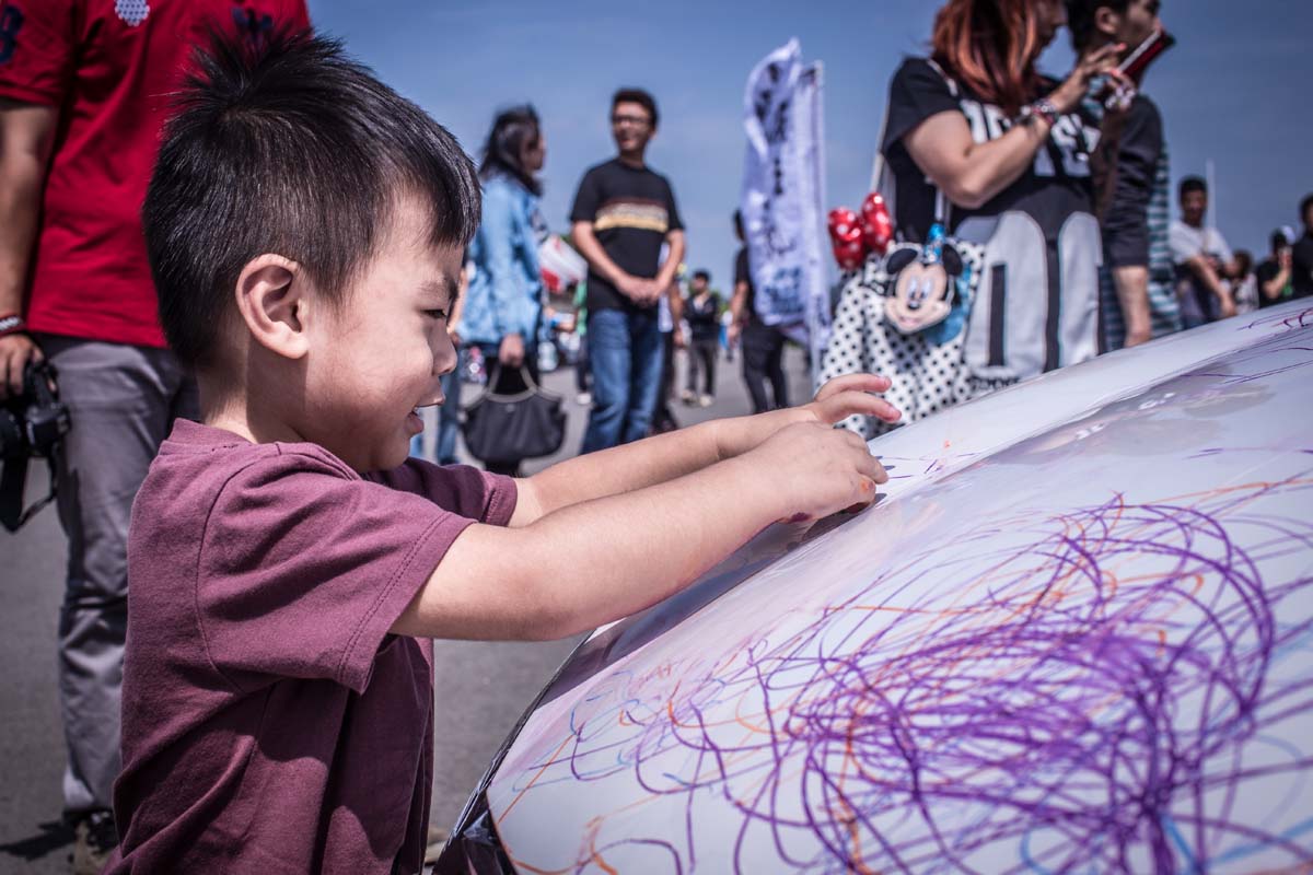 既然是音樂劇會,會場內?本一家也找來了DJ保持現場氣氛不會冷場,另一頭筆者還看到一位小朋友開始在爸爸的愛車上作畫,一經詢問下才發現原來是水溶性色料,一轉眼老爸的愛車就被畫上了特有的彩繪,這可是有錢都買不到的親子樂。