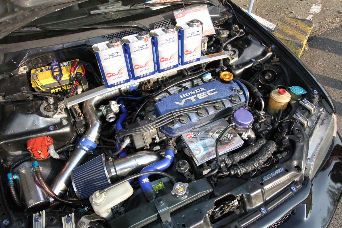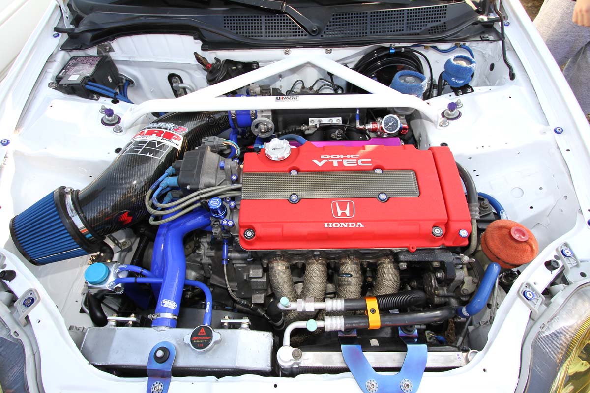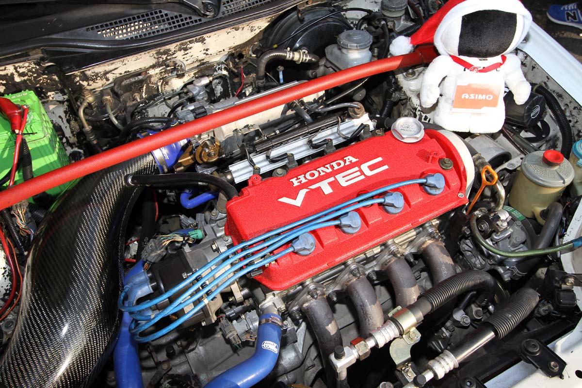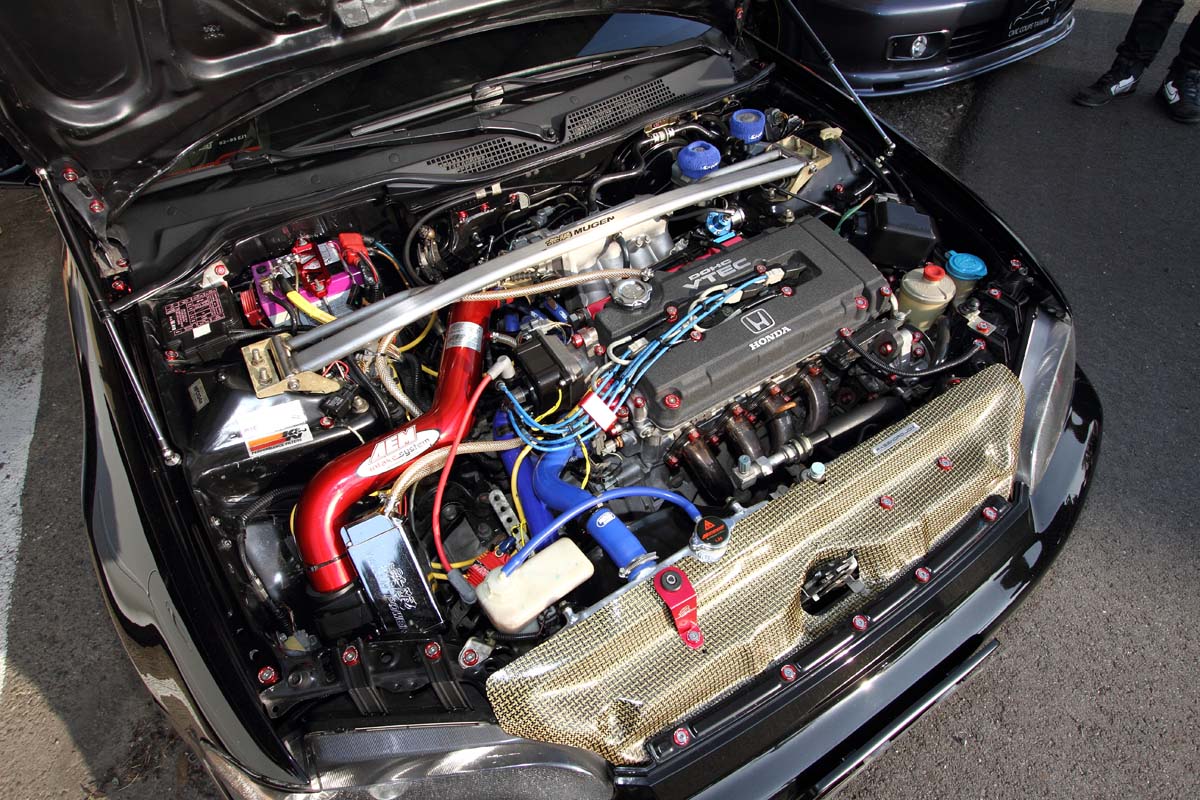 由於當年六代雙門車款的售價不低,加上可選擇的其他車型愈來愈多的情況下,喜美六代Coupe車款在國內的數量比五代少了很多,因此這次聚會中筆者不容易找到改很大的六代車型進行報導,好在有這部隱藏在車陣中的白色車型,遠遠一看就知道應該改很大,打開引擎蓋一看,果然不出所料的是B18C紅頭引擎,且引擎肚內還進行程度不小的強化,連高角度凸輪軸,與好久不見的Apexi Power FC改裝電腦都上車,預估馬力應該有240hp的水準。