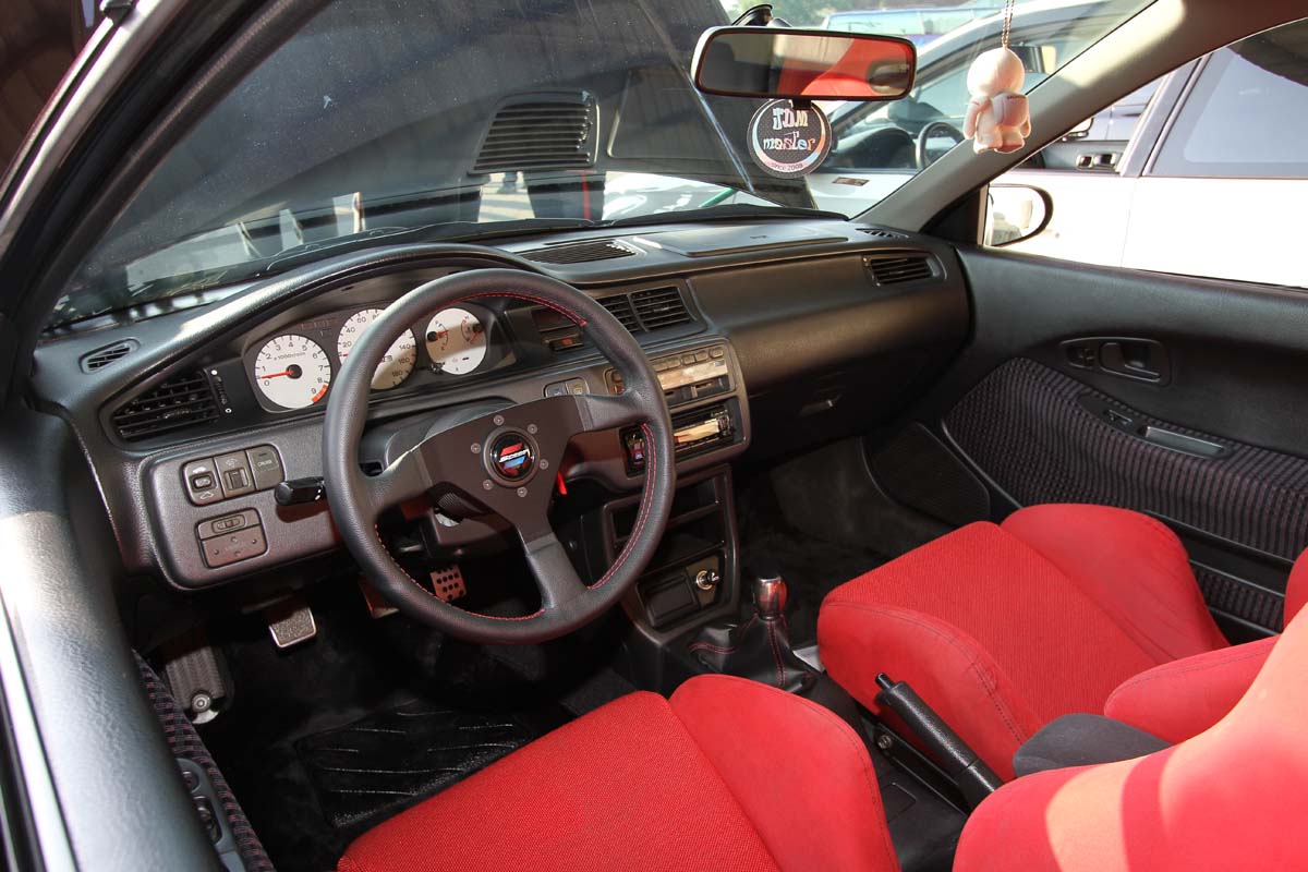 這部五代雙門車款的外型是採用紅黑配色,紅色是車身烤漆的顏色,黑色部分則是透過碳纖維車貼將引擎蓋與行李廂蓋貼成黑色,加上大尺寸Work電鍍鋁圈與低趴的車高,讓這部車有著高調的視覺張力,在路上開應該經常被挑釁吧。引擎部分保持原廠D16A單凸VTEC設定,不過閃亮亮的搖臂蓋配上整理得頗為乾淨的引擎室,依然顯現出相當耀眼的改裝效果,內裝則是同樣保持整潔風格,大螢幕主機加上移植K8下中控,與DC2方向盤、日規儀錶、Bride賽車椅等,讓內外有著相呼應的改裝效果。