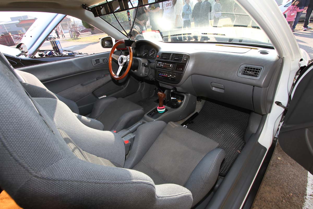 若要筆者在活動當天選一部最美的喜美雙門車款,應該非這部車莫屬,之所以得獎的緣故主要在於內外俱臻,動力部分除了移植B16A雙凸引擎外,引擎室也整理的相當乾淨,幾乎達到一塵不染的地步,周邊也看不到油漬,很難想像車齡已將近20年,看來車主應該很少開這部車才是。車內也是一樣新穎,撇開改裝部品不談,單就中控檯、地毯與各項按鈕的狀況來看,都像新車一樣,看不到髒污、褪色或破損的情況,讓同樣身為K6車主的筆者,內心感到不可思議。