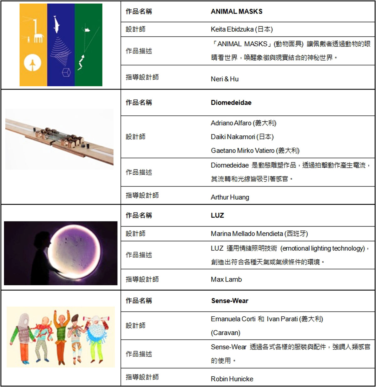 本年度4件原型創作優勝作品,將接受世界知名工程師和建築師 Arthur Huang、遊戲設計師 Robin Hunicke、建築師和設計師 Neri & Hu、以及設計師 Max Lamb 指導,並於2015年4月13日至2015年4月19日所舉辦的米蘭設計週中,與其他8件裱版發表優勝作品一同展出。12名原創設計師也將參與米蘭設計週盛會並於展區與群眾分享設計構想與概念。