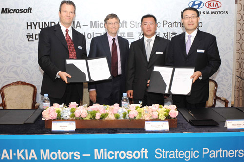 在韓國首爾當地時間五月六日,HYUNDAI-KIA汽車集團與美國微軟公司(Microsoft),由微軟商務經理Martin Thall、微軟總裁Bill Gates、HYUNDAI-KIA總裁Eui-Sun Chung,與HYUNDAI-KIA研發部門總裁Hyun-Soon Lee共同簽署合作備忘錄(memorandum of understanding,簡稱MOU),準備聯手開發次世代車用資訊系統。