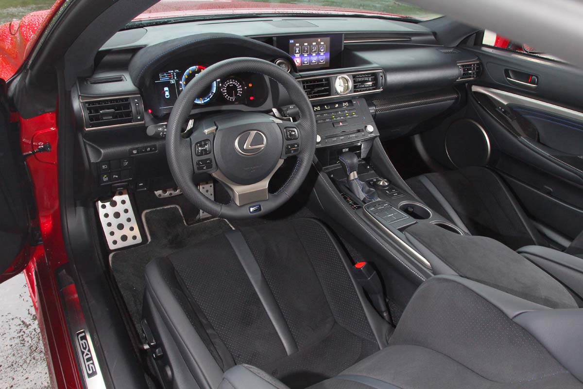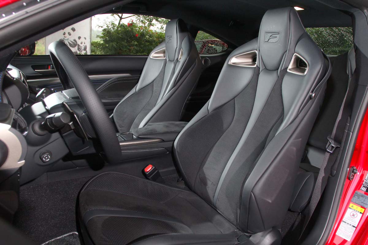 RC-F的內裝設計與RC 350 F Sport幾近相同,且同樣展現出Lexus一貫的細膩高質感,不僅如此,更是將跑車的運動風格加以發揮,車艙內除了車系所擁有的多媒體資訊整合系統、Remote Touch資訊整合操作介面、滑動式直覺溫控系統、Mark Levinson高級音響以及智能多重駕馭模式等豪華科技配備外,最搶眼的莫過於前座那兩張造型漂亮且流線的高質感桶型賽車椅,這賽車座椅不僅擁有相當出色的腰部包覆與腿部側向支撐性外,肩部與頭枕乃採一體式設計,並在上頭開了兩個透氣孔,同時鑲嵌金屬框式,讓車艙內的性能氛圍升至最高點。
