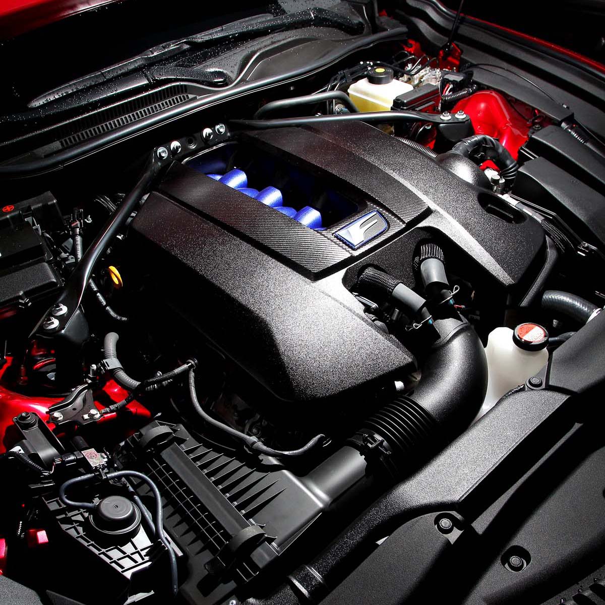 RC-F搭載著一具代號2UR-GSE的5.0升V8自然進氣引擎,這具引擎儘管是以IS F引擎本體為基礎,但幾乎所有零件皆經重新打造,同時採用剛性更強的鍛造曲軸以及鈦合金進排氣閥門設計,並且透過D4-S缸內直噴與VVT-iE電動連續可變氣門等引擎技術,將最大馬力及扭力輸出提昇至477.3hp、54.0kgm,搭配8速SPDS手自排變速箱,0~100km/h加速僅需4.5秒,這般的動力數據與BMW M4、M.Benz C63 AMG等競爭對手們相較亦不遑多讓。此外,由於運用了Atkinson循環科技,引擎在低負載情況下可降低燃油的消耗,使其達到約為4.2升引擎的油耗水準,這也是RC-F仍擁有平均油耗8.7km/L的主要因素,這在高性能跑車上可說表現極為出色。