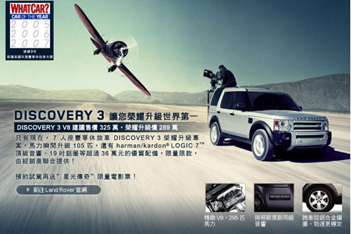 ◎Discovery 3 V8 08年式建議售價325萬,本月交車可享”V6車型價格升等V8車型並配有Logic7等36萬免費豪華配備專案”,由全國經銷商聯合提供,限量、限款專案優惠。