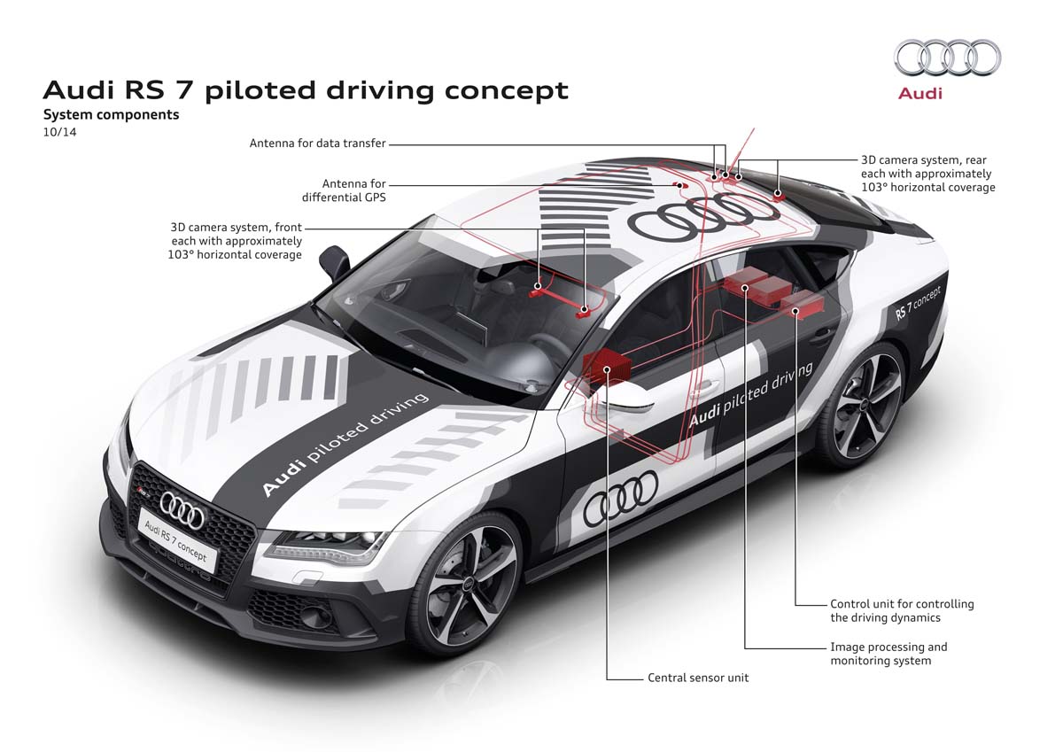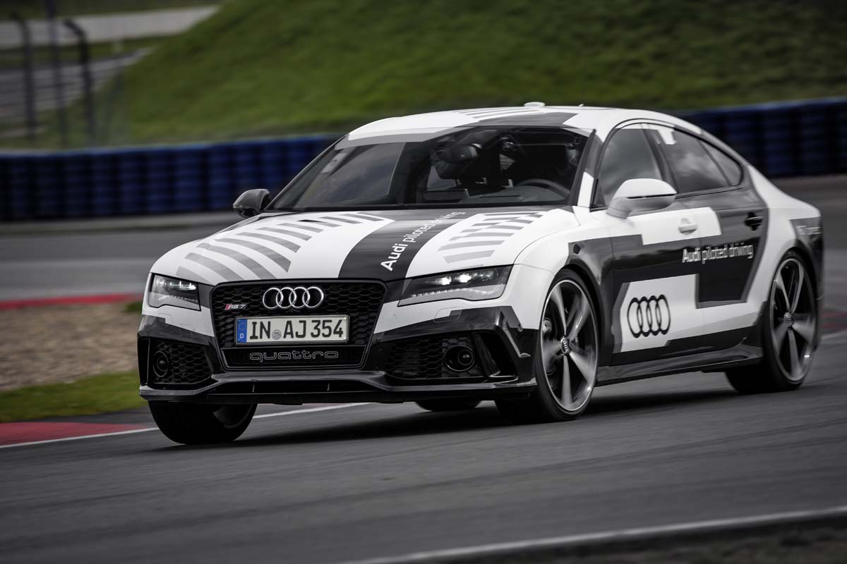 然而,也就在同一時間,德國車廠Audi以2009年開發的技術平台「Shelley」(以Audi quattro成為首位女性世界拉力賽冠軍的女車手小名)為基礎,打造出完全自動駕駛概念車RS7,並以此車挑戰DTM首站Hockenheim賽道,且全程最高時速超過240km/h。此車的技術主要依賴特殊校準的GPS訊號(誤差值小於1cm),以及3D攝影機,並透過數台LiDAR傳感器收集環境變化,再交給NVIDIA Tegra K1處理器進行分析、傳輸指令給機械部件。目前,Audi宣佈將於2017年推出完全自動駕駛的A8。