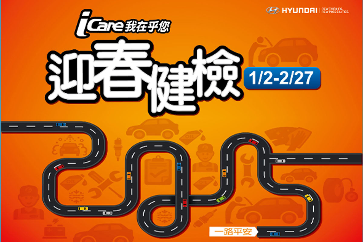 新春期間,HYUNDAI汽車隨時關懷您與您的愛車,為感謝多年來車主的愛護與支持,HYUNDAI春節服務不打烊,「新春行車安全健檢回娘家」活動至2月27日截止。HYUNDAI汽車將以全國優良服務廠,以及八百餘位經驗豐富的技師所組成的優秀團隊,以誠摯的心及專業的技術,替愛車準備了「i Care我在乎您迎春健檢活動」,實施一連串的安全檢查及好康超值服務。