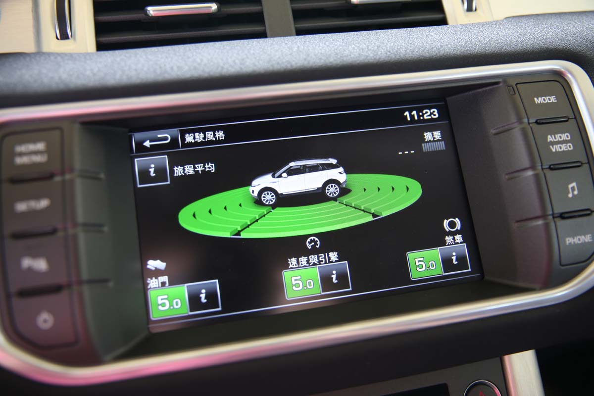 自排變速箱的推出對於變速系統來說為一大進步,從前變速箱升級至六速就已讓人大感驚艷,所帶來的行路舒適性遠勝四速系統,而正當七速與八速變速系統普及之際,Range Rover Evoque則配置更高一階的九速變速系統。搭載九速變速系統的汽油版Range Rover Evoque,油耗較先前車型有著10%的進步程度,本次新增的2.2升柴油車型,在搭配九速變速系統後將帶來更優異油耗成績。本次Range Rover Evoque所搭載的2.2升柴油引擎,是來自旗下另一款Freelander 2車型,不過Range Rover Evoque則將動力輸出稍作調整,最大馬力調降至150hp,最大扭力也降至40.8kgm,雖動力稍作下修,但更加出色的節能表現才是Range Rover Evoque柴油訴求重點。在九速變速系統助益下,Range Rover Evoque柴油有著14.9km/L平均油耗,與159g/km碳排放量,不論與同車系汽油車款甚至採相同動力的Freelander 2皆來得更為出色,這從當天試駕台北淡水來回超過百公里的路程僅消耗不到一格的油量便可看出。