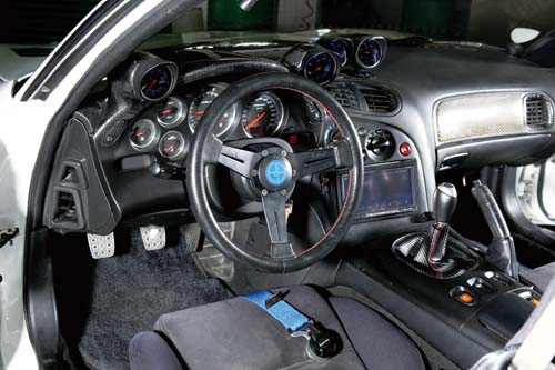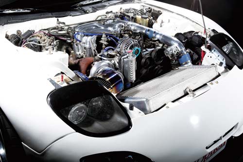 而引擎周邊也做了不少升級,整體渦輪管路系統是由相當專精轉子引擎改裝的「弘宇」負責打造,渦輪頭段為店家自製品,而進氣冷卻器與水箱呈V型配置,搭配Blitz進、排氣洩壓閥等部品,而進氣系統則使用了最近相當熱門的Raemco製品。供油方面使用二支550c.c.與二支850c.c.噴油嘴,再以Bosch加大汽油泵浦與Sard汽油調壓閥來提供穩定而足夠的供油量。至於改裝車最重要的電腦方面,並非使用相當熱門的V-Pro,而是使用過去許多改裝店家愛用的Power FC。
