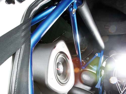 內裝部分使用了大量的碳纖維套件,包含EVOR碳纖維門板、儀錶板、盤檔座等,儀錶板及中控檯上方共五顆Stri監控儀錶,搭配Nardi小凹經典款賽車方向盤戰鬥力十足。後座則裝上Cusco半套防滾籠,不過最引人注目的是特別設計成三角轉子造形的Rockfordfosgate重低音音響,還有後車廂內的外場影音設備,在夜間開啟所有音響設備簡直就像國外Show Car一樣炫麗!