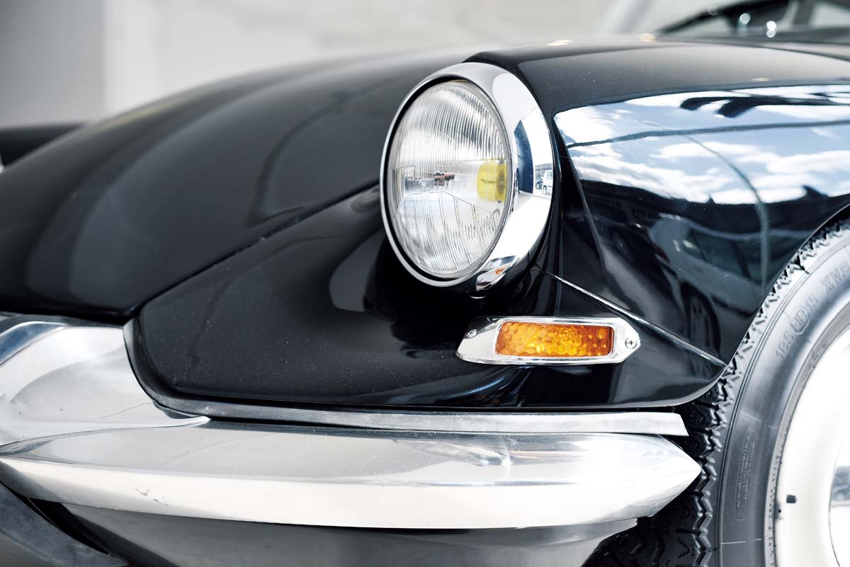 你無法一語道盡DS所代表的意義。它那傳奇的高液壓系統科技,還只是汽車工程學專家所下的崇拜註解而已,真正的堂奧其實還在於那些屬於「軟體」的抽象美學部份。在那戰後不久的年代,Citroen就以如此流線而極簡的車體風格,宣告了將時代帶往未來的決心。幾乎沒有太多接縫、稜角的平滑鈑件,在當時活像是來自科幻電影一般,就連電鍍的前保桿和防撞護塊(這尖突的兩點頗為挑逗),也與引擎蓋接合成完美的弧形──別忘了它是一部房車。設計成圓柱形的立體頭燈曲線,恰如其分地為輪拱預留了平滑的葉子板表面,而整面車側除了下方的鍍鉻飾條外,沒有任何的折線或門檻、側裙鈑件。一切,就像女神的玉體般光滑無瑕。