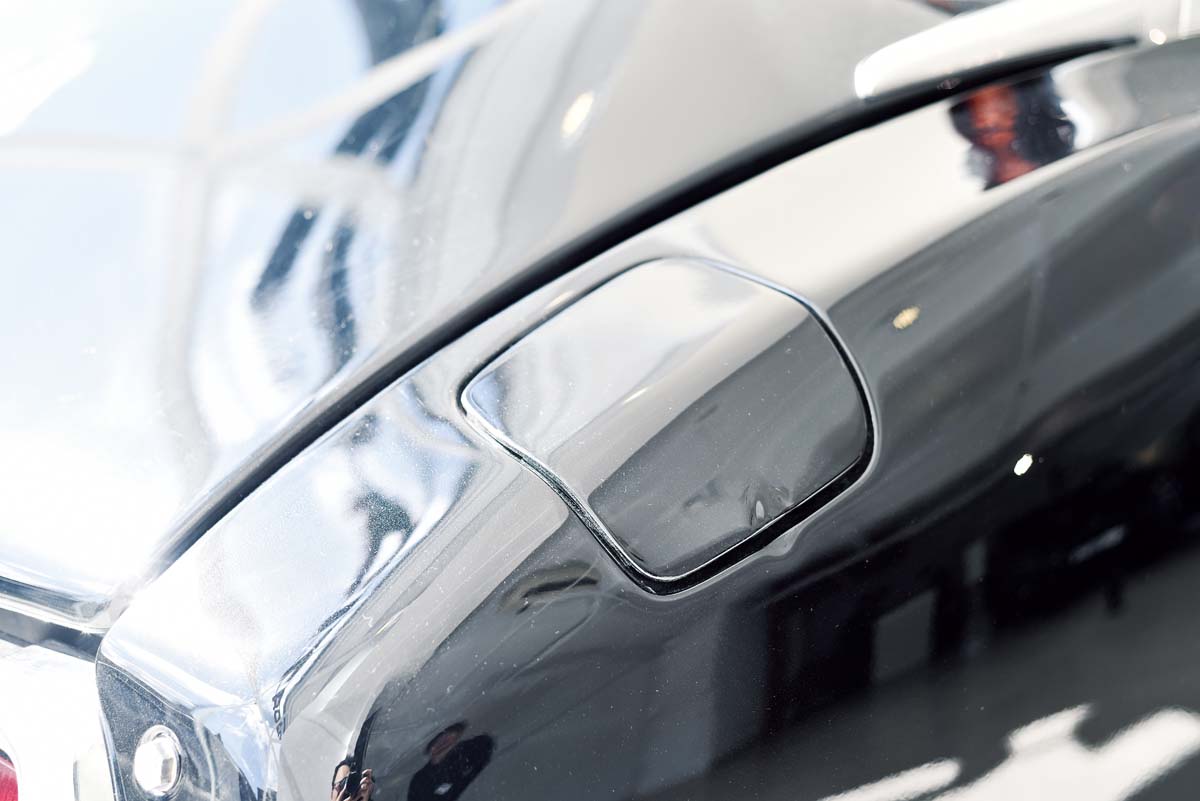 | 電鍍的前保桿和防撞護塊,與引擎蓋接合成完美的弧形,這種極為流線的設計,對一部房車而言頗不尋常。 |