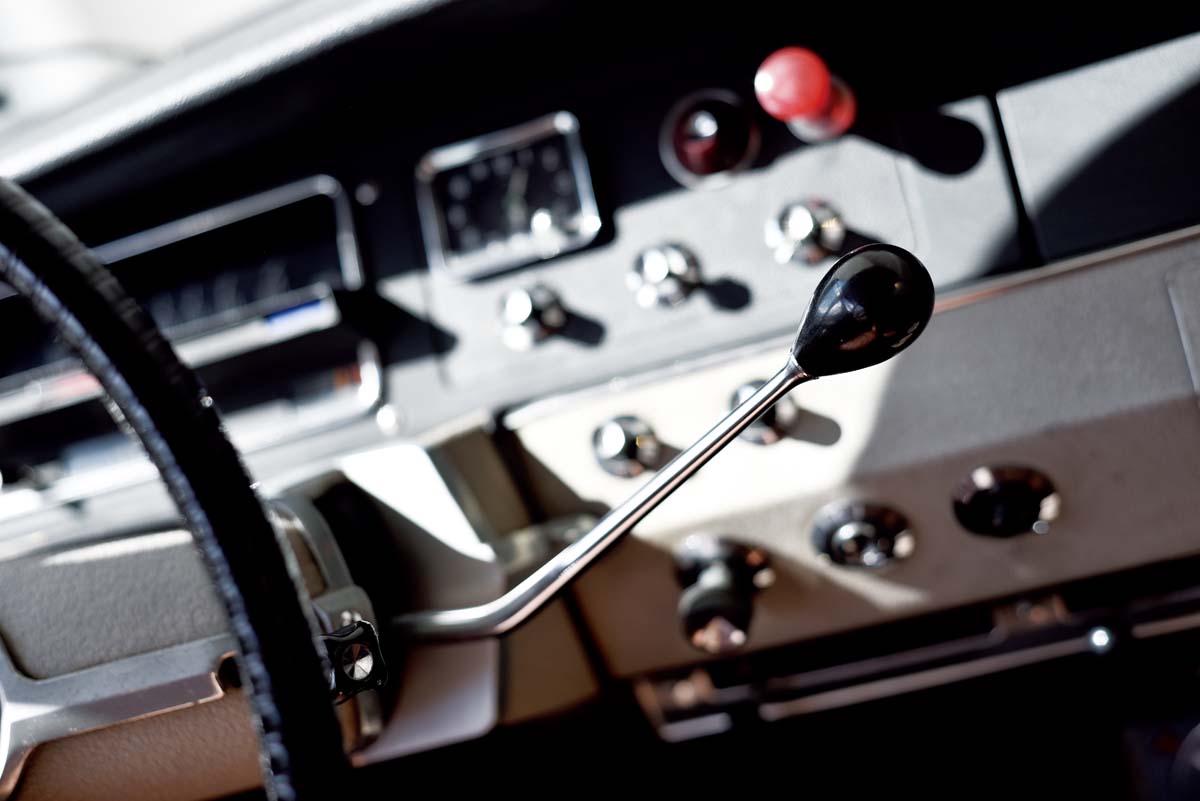 | 位於方向盤後方的排檔桿是當時的流行,它搭配了不需離合器即可換檔的高液壓系統半自動變速箱。 |